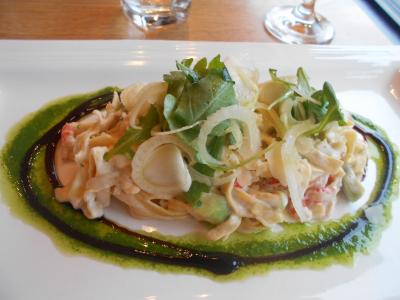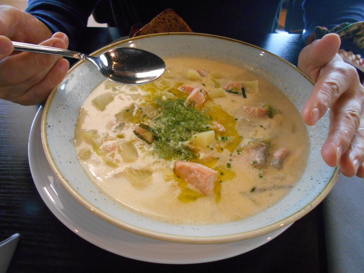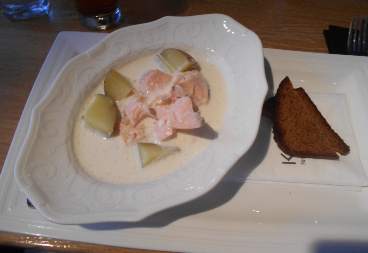 雨が降って寒いヘルシンキに着いた夜。まだ方向感覚も機能せず、とりあえずホテルの近くで見つけようとショッピングセンターフォルムに入りました。ぐるぐる歩き回りどちらを向いてるかわからなくなりましたがこの店にたどり着きました。 後から考えると表通りから入れば簡単でした。ストックマンに近い方の角にあります。お店は2階。シックな感じでカウンターが見えたのでお酒だけのお店かと思いましたが、食事は盛り付け味共に日本人好みでした。サーモンのスープは大と小があり魚の処理が良いのか全く生臭くありませんでした。タリアッテッレも盛り付けがおしゃれでした。2人で44.40ユーロ。飲み物代を含みます。