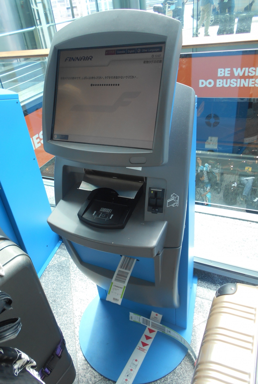 出国の際は、自分で機械でバーコードシールを出し、自分でスーツケースに巻き付け、自分で重量計に乗せました。横には空港職員が一人いるだけでした。出国ゲートがフィンランドに入国していく人の荷物受取ゲートと混在していて、外に出てしまったのでまた2階に上がりボディチェックを受ける羽目に…。でも職員の慣れ具合から私達みたいな人がたくさんいるように感じました。くれぐれも免税店フロアから下に向かう階段を使わないように!出国審査は同じフロアにあります。- 旅行時期