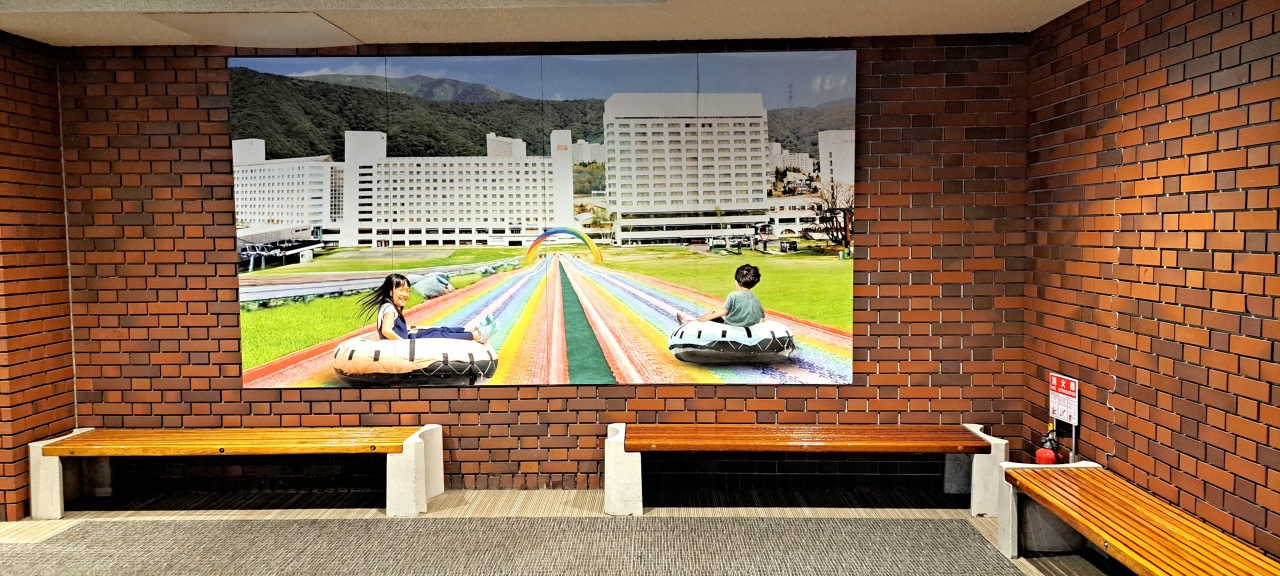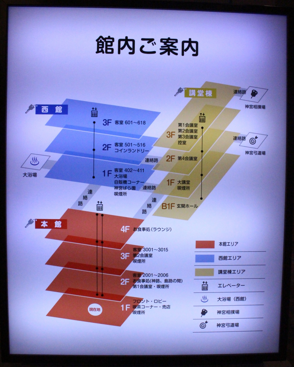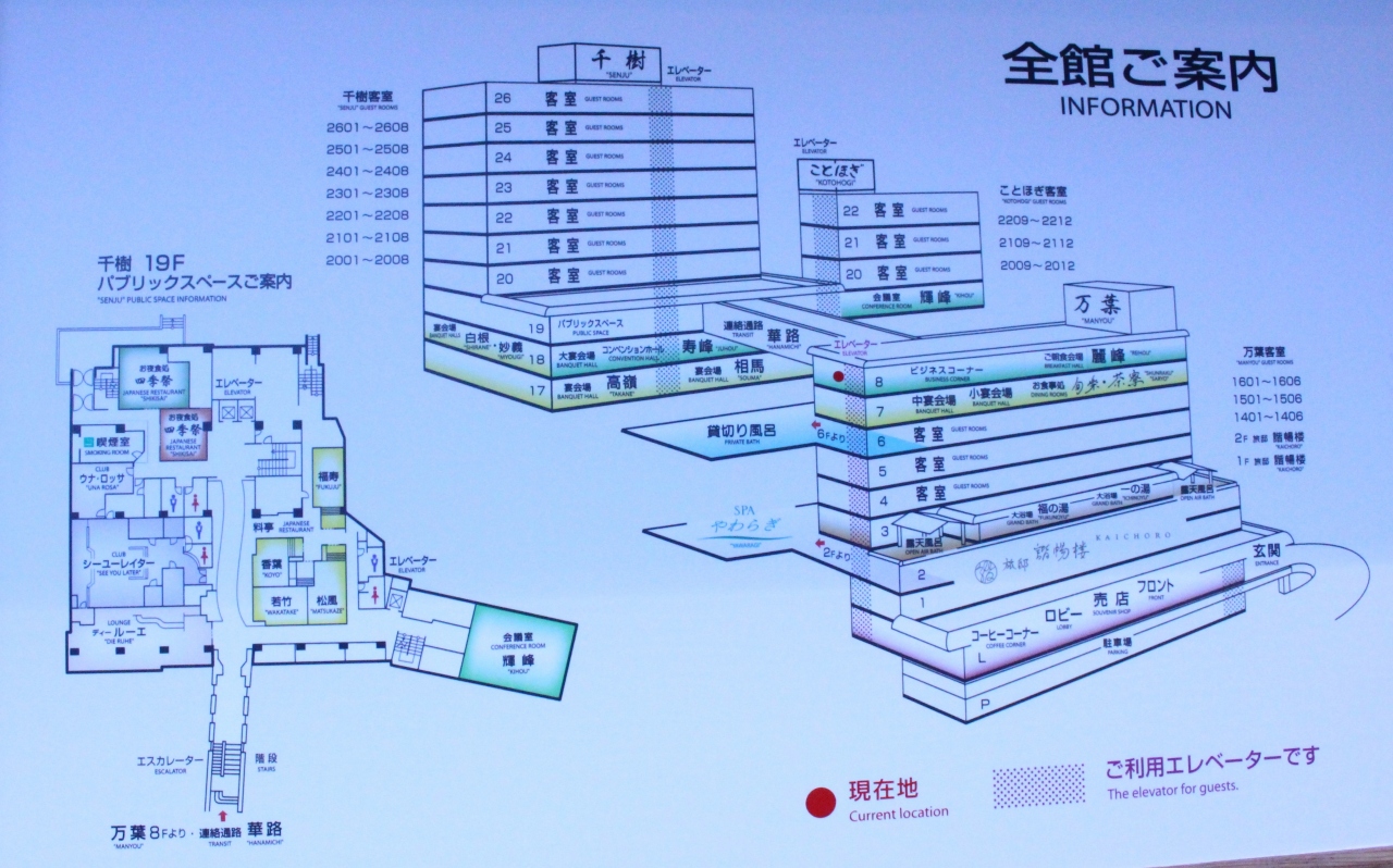 階段下から電話すると直ぐに迎えに来てくれました。フロントは万葉館という建物にあり、大浴場もお食事処もこの建物にあるので足に自信の無いお方は万葉館に泊まった方がよいと思います。エレベーターを乗り継いだり階段しかないところもあったので千樹館は裏から階段に直ぐ出られますがちょっと迷いそうです。慣れた頃に帰ることになりました。