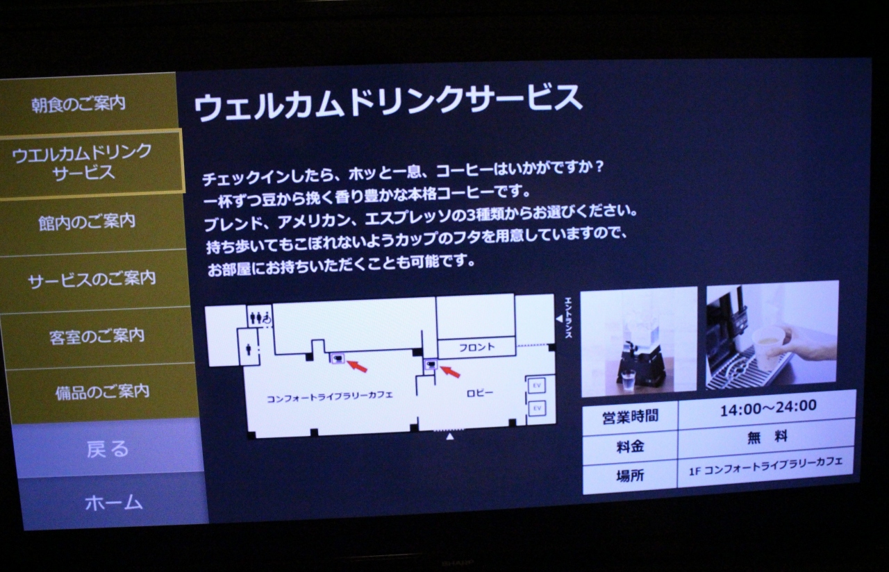 泊まるだけのところを探していました。食事はしませんでしたが朝食会場は広くて開放感のあるゆとりのあるセッティングでした。大きいテレビが有りコーヒーなら何時でも無料でいただけます。