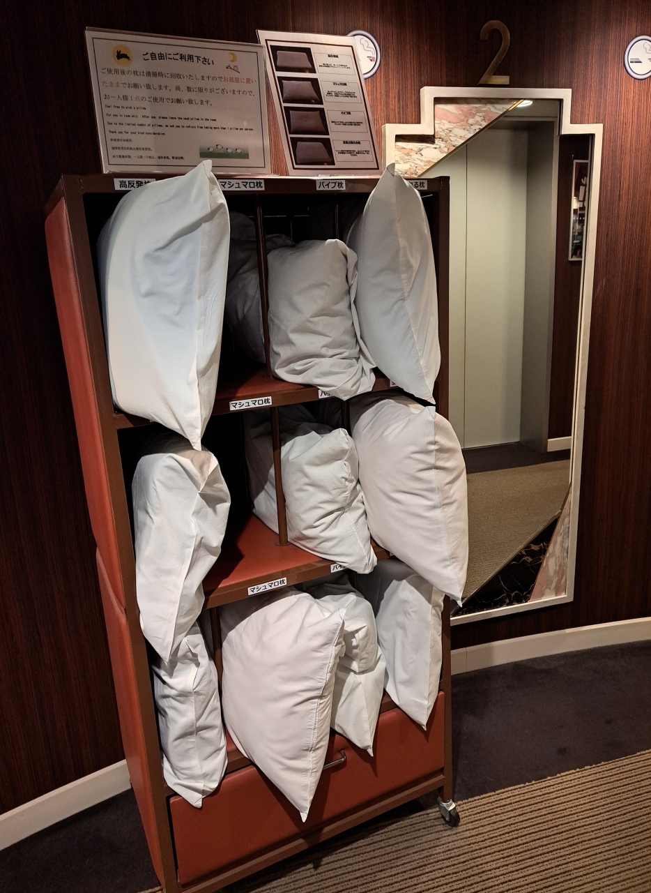 枕が選べるチェーン店です。フロントでの説明は丁寧すぎるほど丁寧でしたがどこかマニュアル通り という感じがしました。 3階が女性専用フロアで女性用の大浴場がありましたが 私達は別階でしたので3階に無料のコーヒーがあるとは知りませんでした。たまたま見つけたので利用しましたが、大浴場に行くだけならその前を通ることがないので気がつかないでしょう。大浴場の鏡の前にはコーヒーのことが書かれていましたが夜中には飲まないよな~と思いました。また大浴場にはドライヤーがないので困りました。部屋にも1つしかないので女性二人ならレンタルすることになるかも。