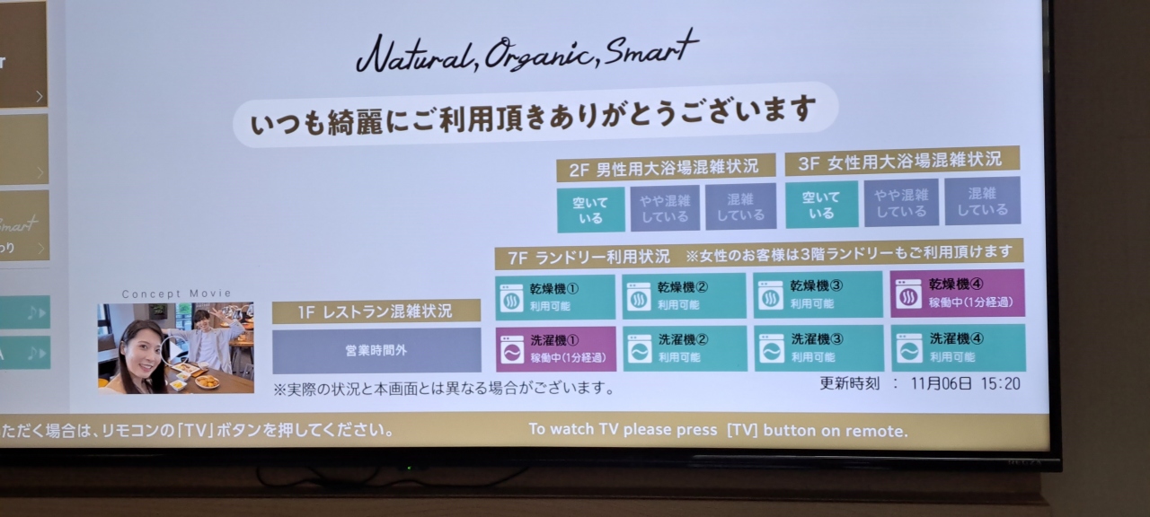 1日前にスマホにQRコードが送られてきて、チェックインはこのQRコードでしました。ルームキーも朝食券も機械から受け取り、対面で何か話すこともありません。アメニティは必要な物を持って行く方式で入浴剤がありがたかったです。 朝食の種類が多く地元のものも有り地方からの人も楽しめたと思います。