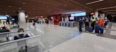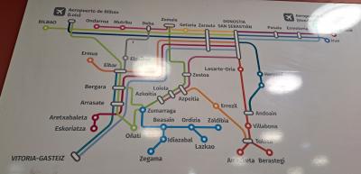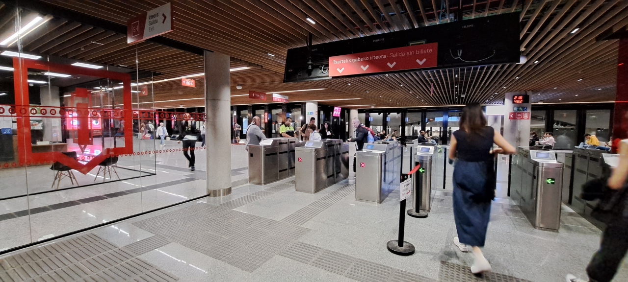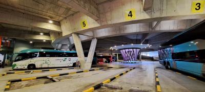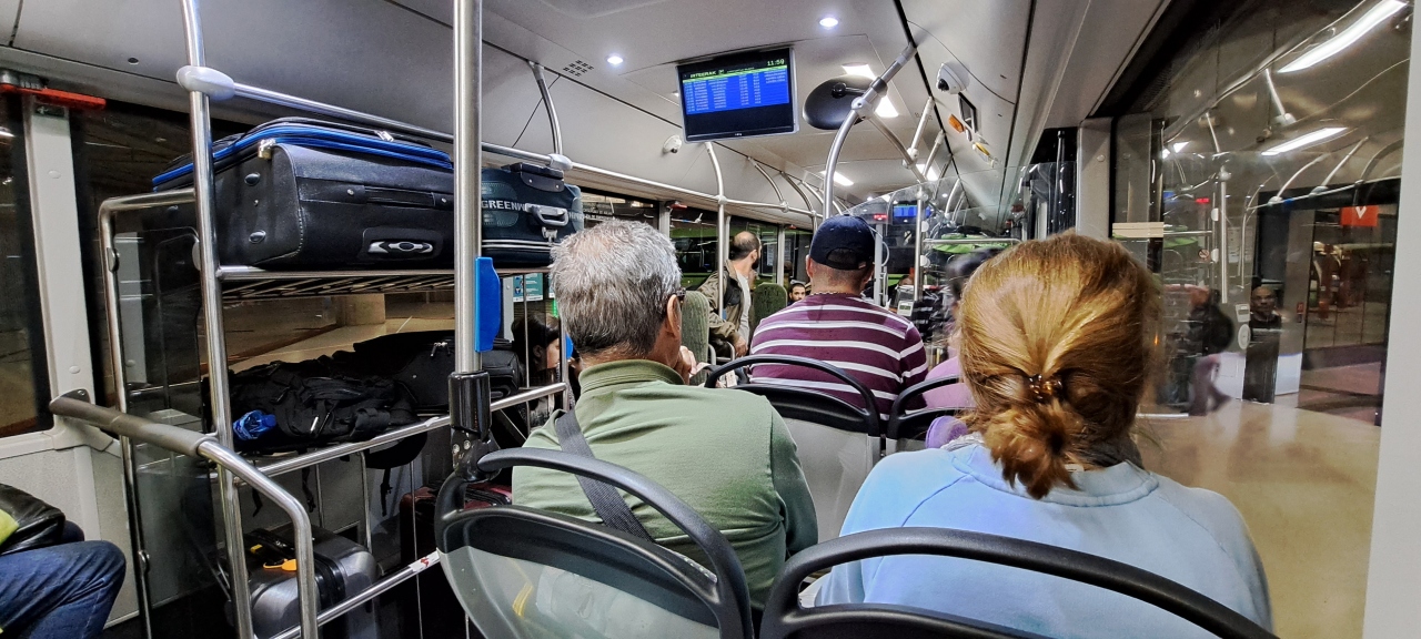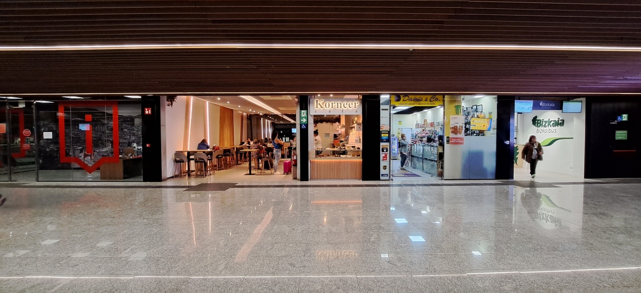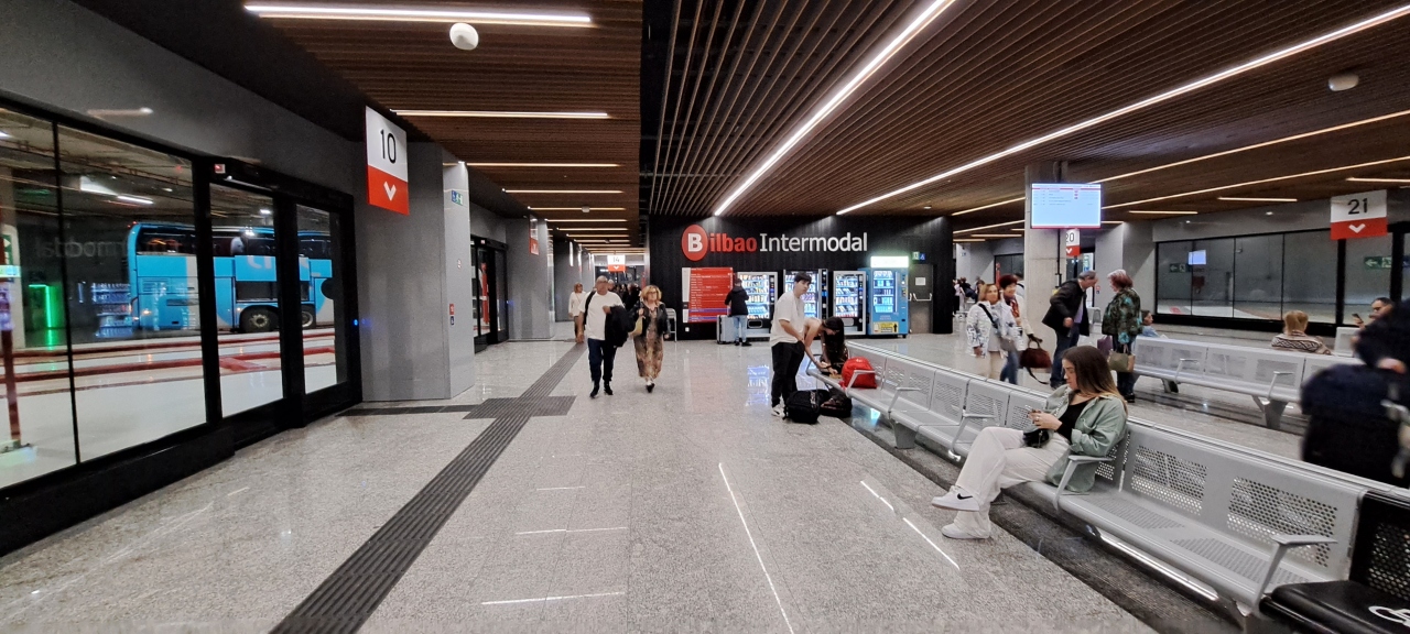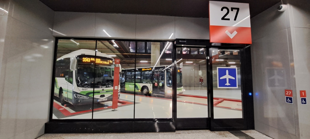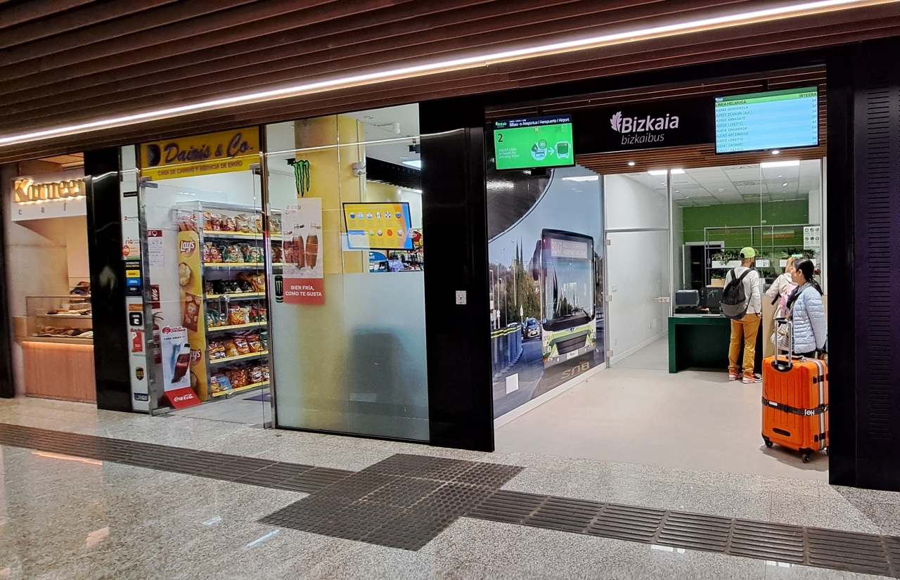 2019年に行ったときはまだターミナルは地上でした。現在は地下にターミナルは移り、バルもあります。今回、サンセバスチャンからビルバオに移動し、いったんビルバオ市内を観光しようと思いましたが疲れてしまい直ぐに空港行きのバスチケットを買い空港に移動しました。空港行きのバスは改札を出て左に進むと一番奥の場所にあるBizkaiaと緑色の文字で書かれたカウンターです。外から入ってきた場合は地下に降りて直ぐ目の前です。一人3ユーロで乗り場は改札を通って更に降りた地下2階の27番です。飛行機のマークがついてるので直ぐ分かります。このバスにはなるべく早く乗ることをお勧めします。スーツケースなどを置く場所が色々あるのですが後から乗ると上の方に持ち上げなければいけません。途中3カ所ほど留まりますが車内のスーツケース置き場は始発のビルバオでほぼ埋まってしまい、車内も混んでいるので大きなスーツケースを持ってる方は途中乗車は避けた方が無難です。