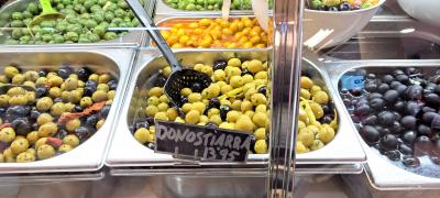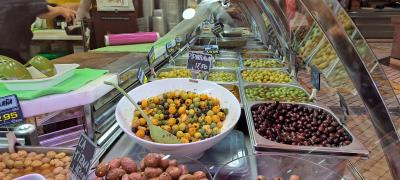 ブレチャ市場には地下にスーパーマーケットもあり、肉や魚、ピンチョスの専門店などもあります。ここへ来たら是非オリーブ専門店へ行っていただきたいです。いろんな種類のいろんな味のオリーブが売られています。5年前にも買いましたが今回は別の味を勧めてくれました。「バキュームにするか?」と言ってくれて空気を抜いて袋に詰めてくれます。空気を抜いても大丈夫なのは硬めの物らしく店のご主人やセニョーラにお任せしたらいいと思います。試食もさせてくれますよ。地上部分は改装が終わっていてサンリオやディズニーのグッズ店やコスメの店、マックなどが入っていました。