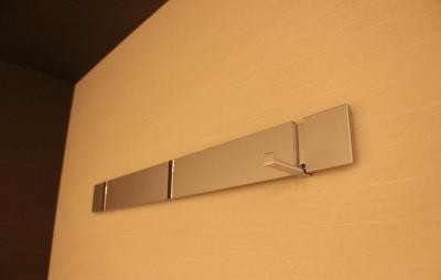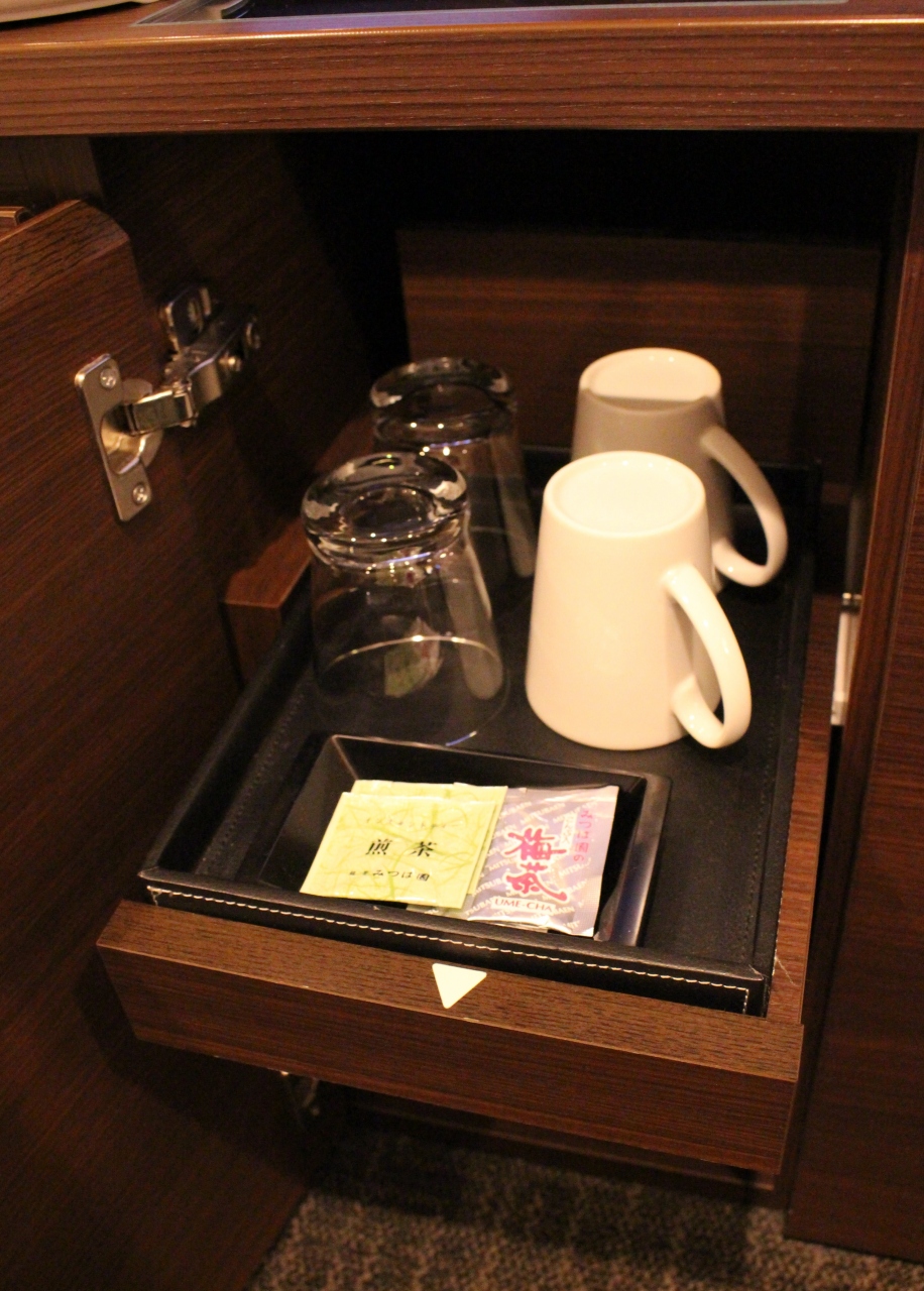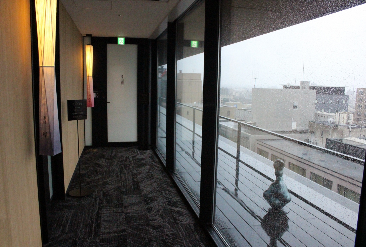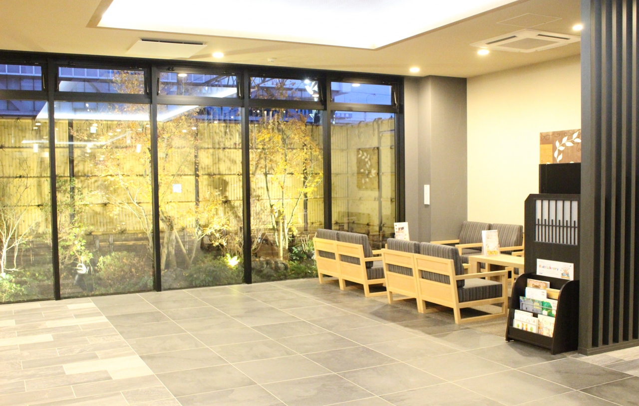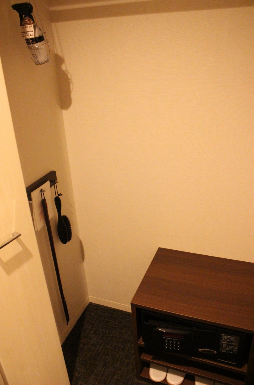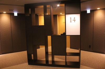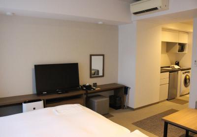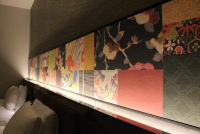 南町のバス停から歩いて2分ほどで着きます。ロビーに入った途端アロマの香りに包まれます。黒と和柄のお部屋はあまりにシンプルにまとめられていて冷蔵庫とお茶セットを見つけるのに少々時間がかかりました。壁に取り出して使うフックもあるのでお見逃しないように。