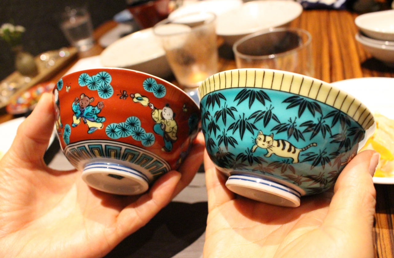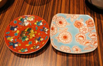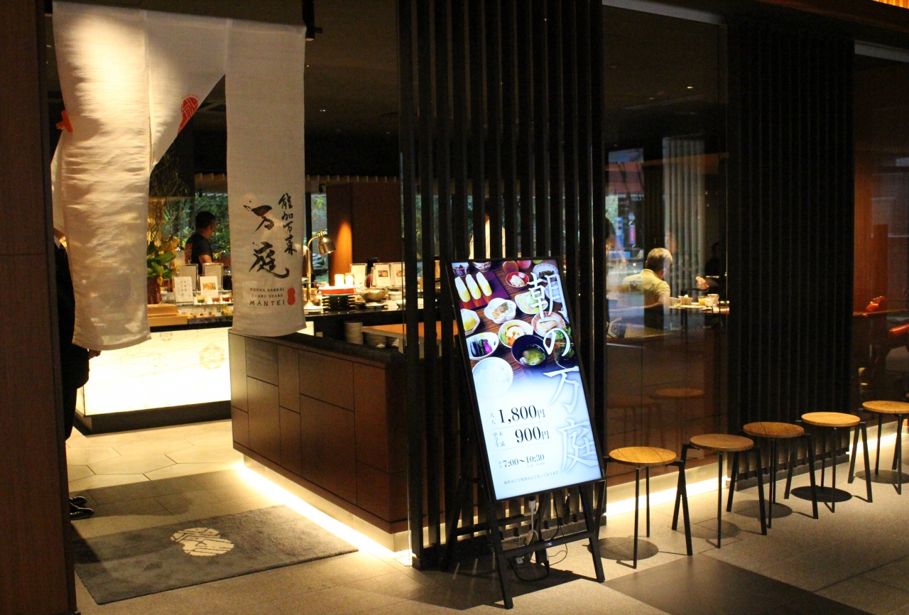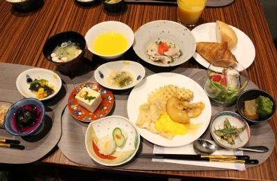 ここのメインは朝食と言ってもいいくらい素晴らしかったです。金沢に住んでいる人でもここまで加賀野菜を集めることは難しいでしょう。金時草のお浸し、車麩の煮物、能登豚のしゃぶしゃぶ、加賀野菜のサラダ、治部煮、加賀豆腐の奴などにパンやかぼちゃののポタージュまで。そしてオリジナルカレーにかわいい小さな野菜寿司。これらが惜しげもなく九谷焼の小皿や小鉢にのっていて少しずつ食べきれる量で提供されています。お茶も加賀棒茶をはじめ4種類あり、お湯呑もお茶碗も好きな柄のものを選んで食べました。宿泊客でなくても1800円でこれらが食べられるならとてもお得です。
