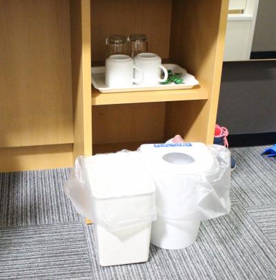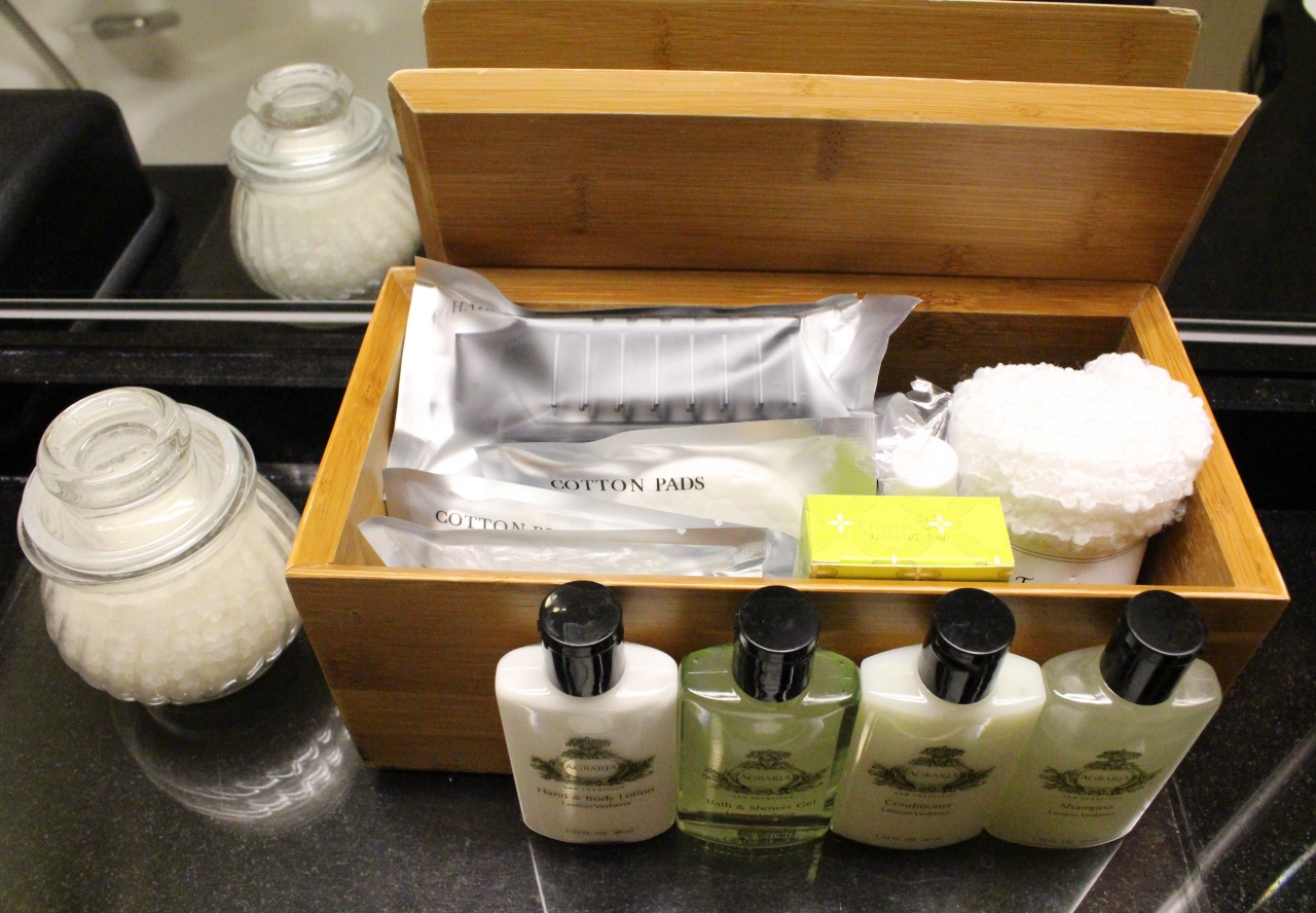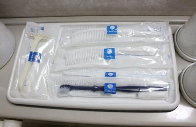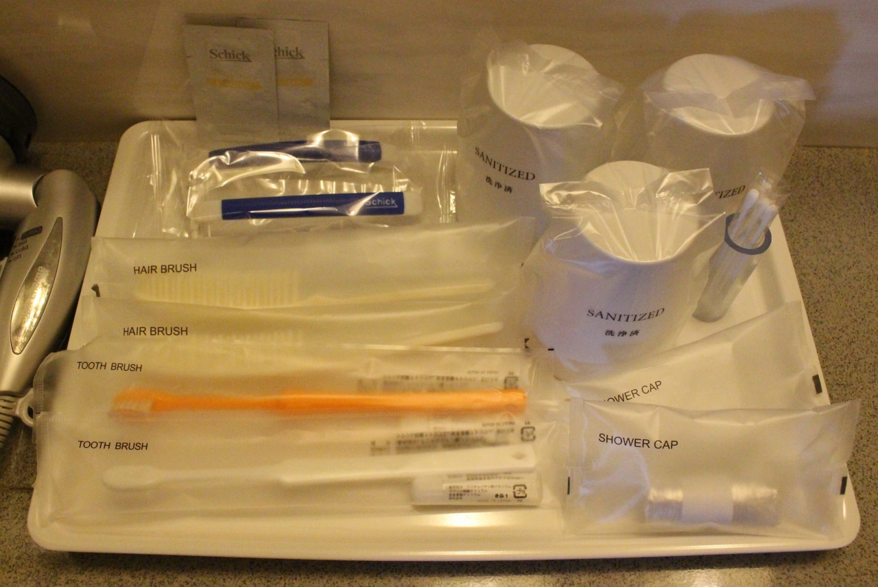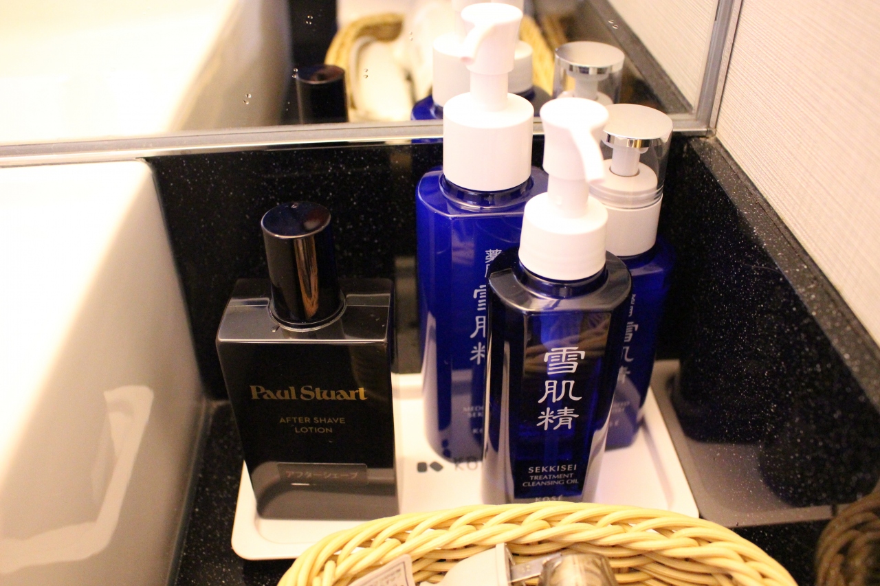 フロントは3階。客室フロアへはエレベーター内でカードキーをかざすと自分の部屋のフロアに自動的に行けます。洗面台下にアメニティが収納されていました。