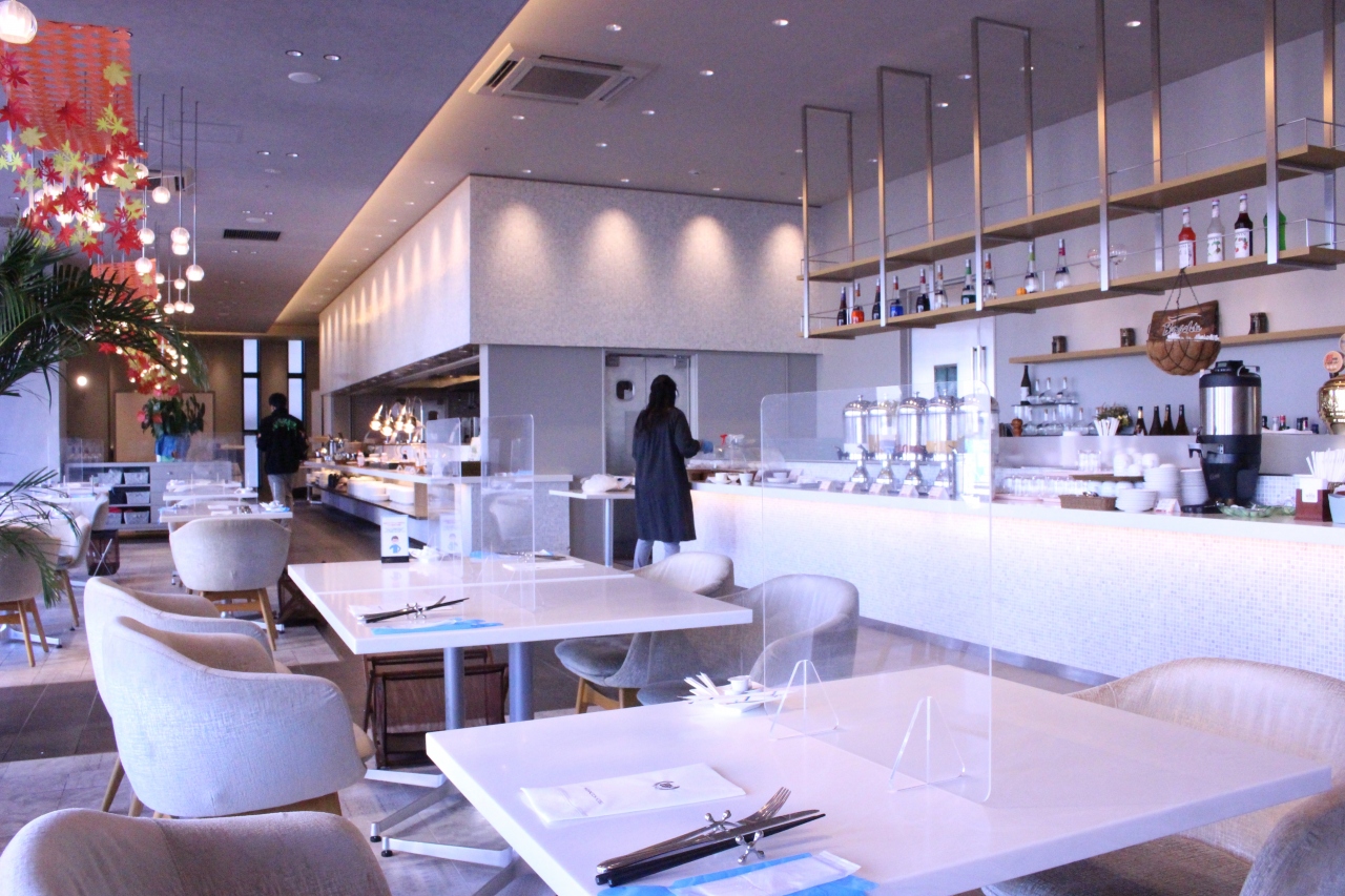 朝食は2階のボンサルーテでいただきましたが二人用のテーブルにも透明のパーテーションがあり使い捨て手袋も用意されていました。料理はサラダもスクランブルエッグも小皿に取り分けてあり配慮が感じられました。