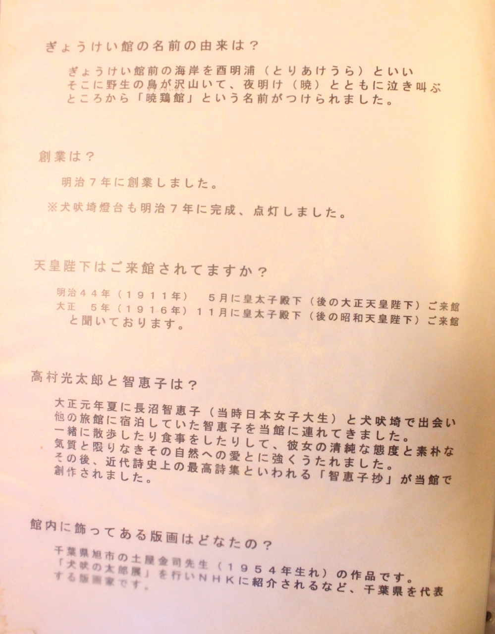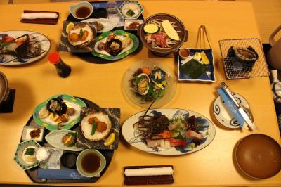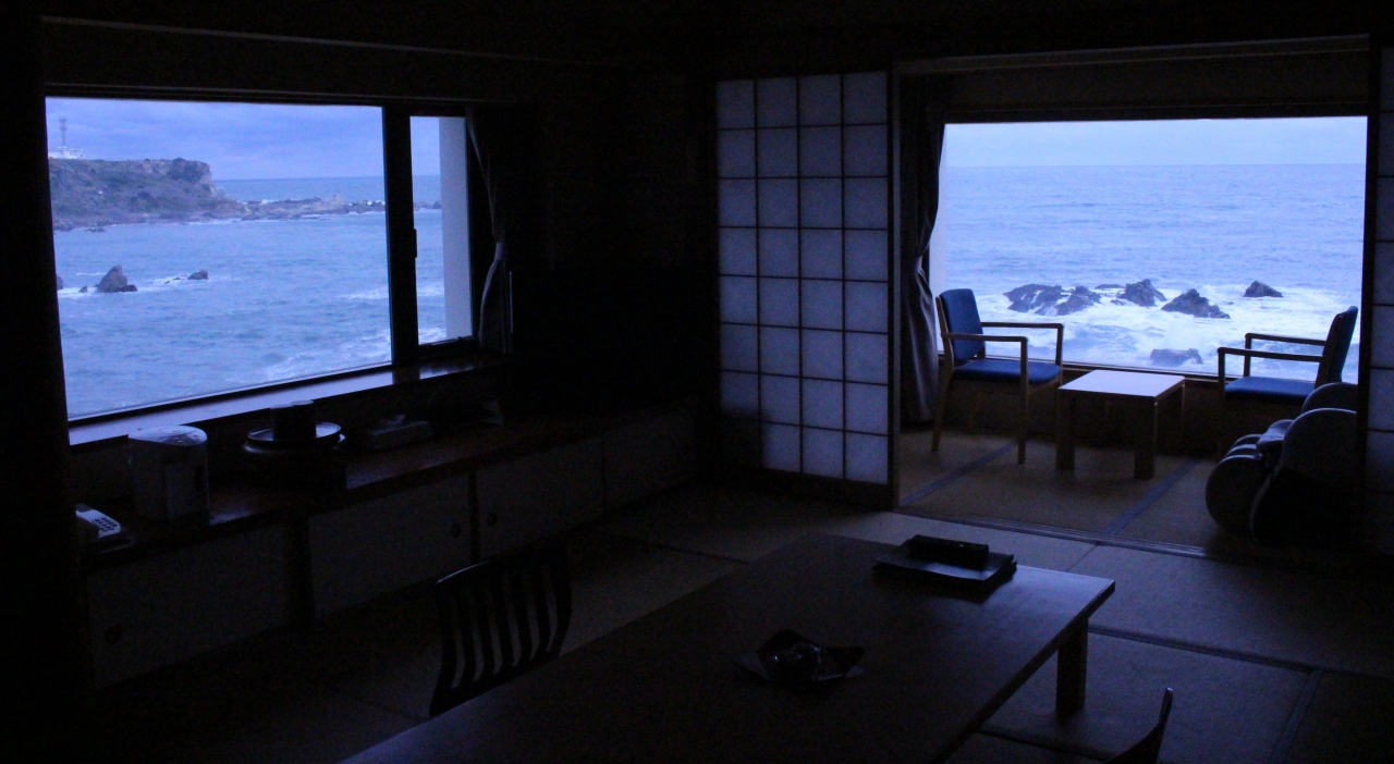 施設は古さを感じるものの犬吠埼灯台がまるで絵はがきのように見えてお部屋の檜風呂からも見ることが出来ました。夕食は部屋でいただき、伊勢エビ、アワビなども食べられました。大浴場は施設の端っこでかなり歩きましたが出た後の肌が何もつけないのに全く乾燥しなかったので翌朝もう一度入りに行きました。雲が多くて日の出は見られないと断念してから行ったら大浴場で雲から出てきた太陽を見ることが出来ました。