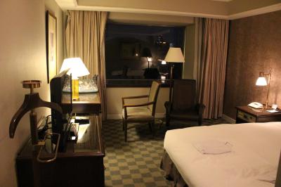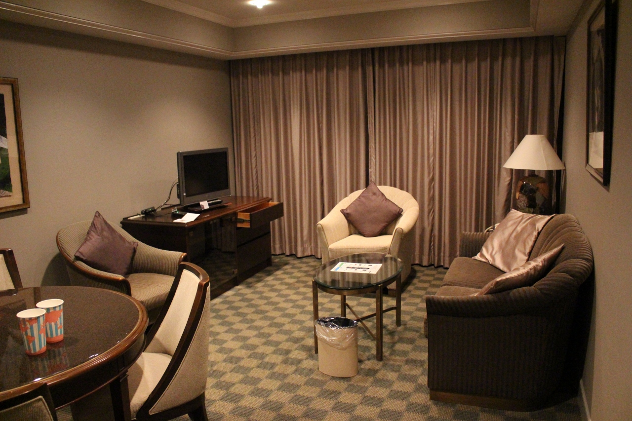 お部屋はビジネススイート。ドアを開けると左右に寝室とリビングがあり真ん中がバスルームという配置でした。寝室にもリビングにもテレビがありそれぞれ違う番組でもまた寝る時間が違っても迷惑はかけなくて済みます。寝室にはデスク、マッサージチェアもあり、リビングは丸テーブルに椅子4脚、ソファーセットもあり二人でどうやれば全部使えるのか?と思いました。寝室からの眺めとリビングからの眺めは全く反対側が見えて楽しめましたが部屋の移動に結構歩きました。部屋に入ってからこんなに歩いたのは初めてかもしれません(笑) チェストやテーブルなど年季が入っていましたがきれいに掃除されていて、ティッシュの場所には1パック予備が置かれていました。