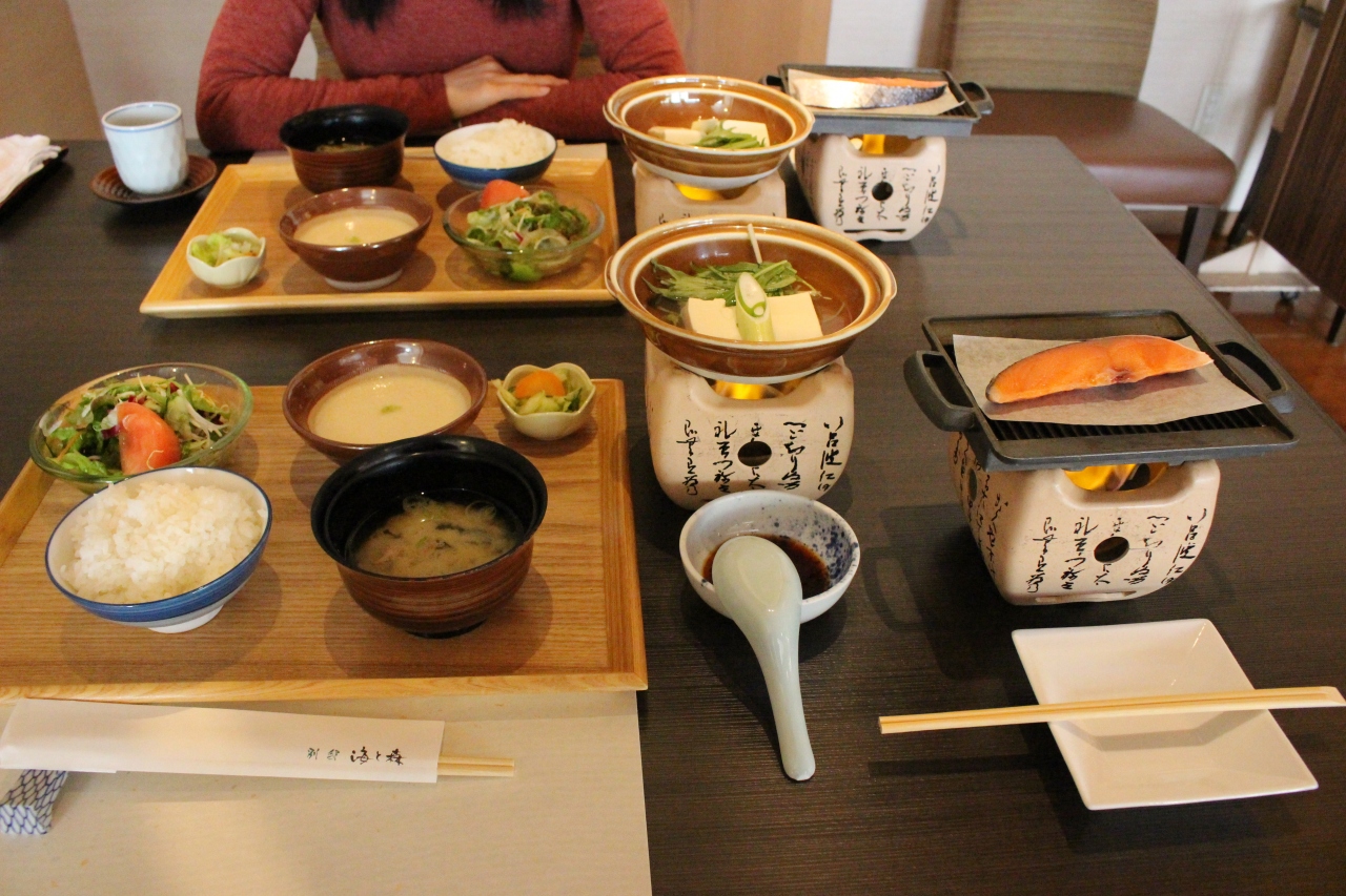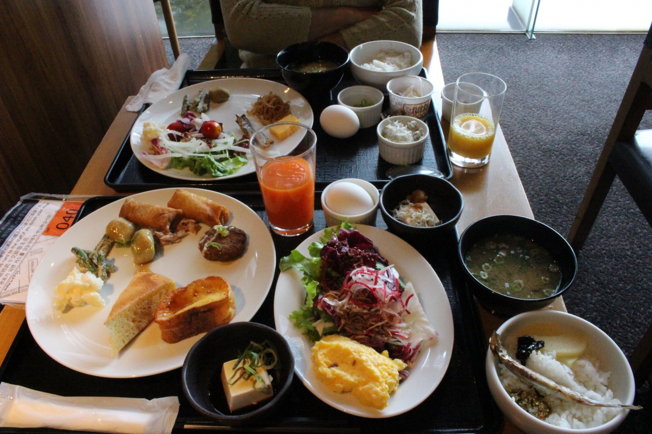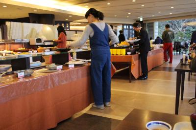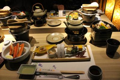 夕食は和食処「加賀」の半個室(お隣の声は聞こえます)でいただきました。食事は色々コースがあるみたいなので一概には言えませんが、味も量も最高でした。お造りの新鮮さは他に類を見ないほどでした。松茸ごはんはおこげもあっておいしかったのにお腹いっぱいで残してしまいました。朝食会場は彩雲という宴会場のバイキングでしたが、干物をあぶって食べたり、小さなお鍋に豆乳から作る手作り豆腐を食べたり、また、パンケーキやヨーグルトもあり和洋どちらも楽しめました。