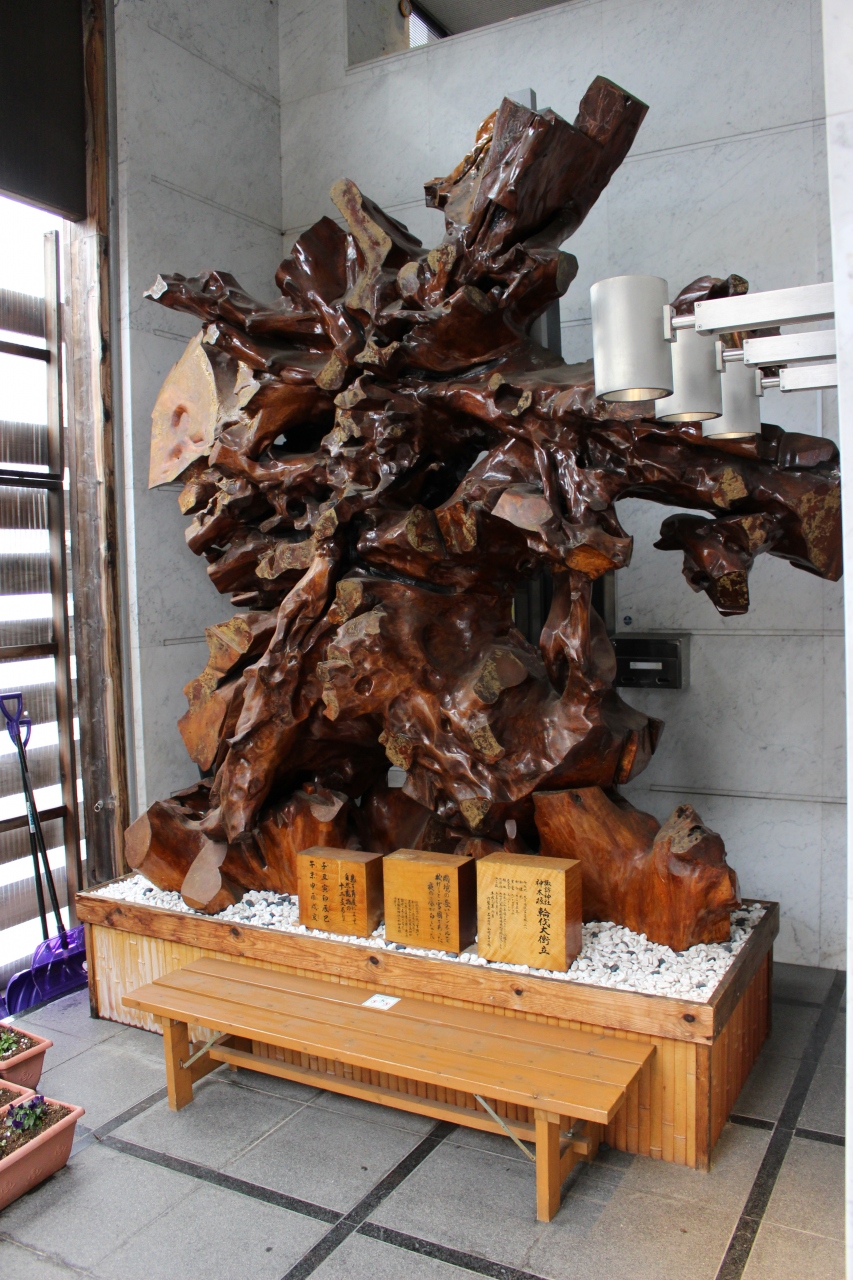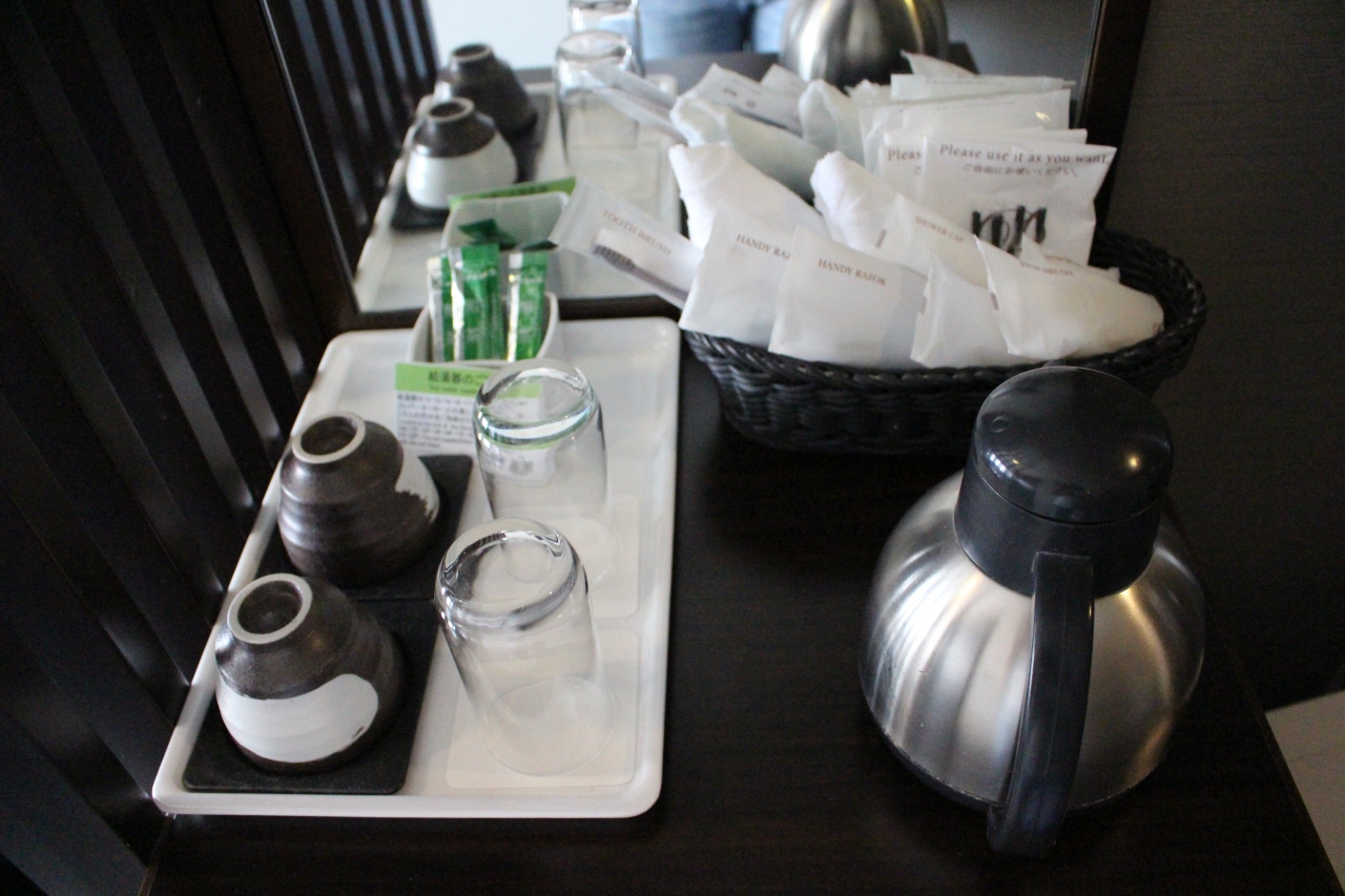 2階がフロントですが、エスカレーターの両脇に5メートルほどの大きな壺がありこのエントランスに立つと美術館に来たかのような錯覚に陥ります。大浴場に行くまでの廊下にも季節の写真が飾られていてフロント横には手作りできるギャラリーもありました。着いてすぐはラウンジでお茶とお菓子をいただき、お部屋にはすでにお湯のポットと冷たいお水のポットがありました。