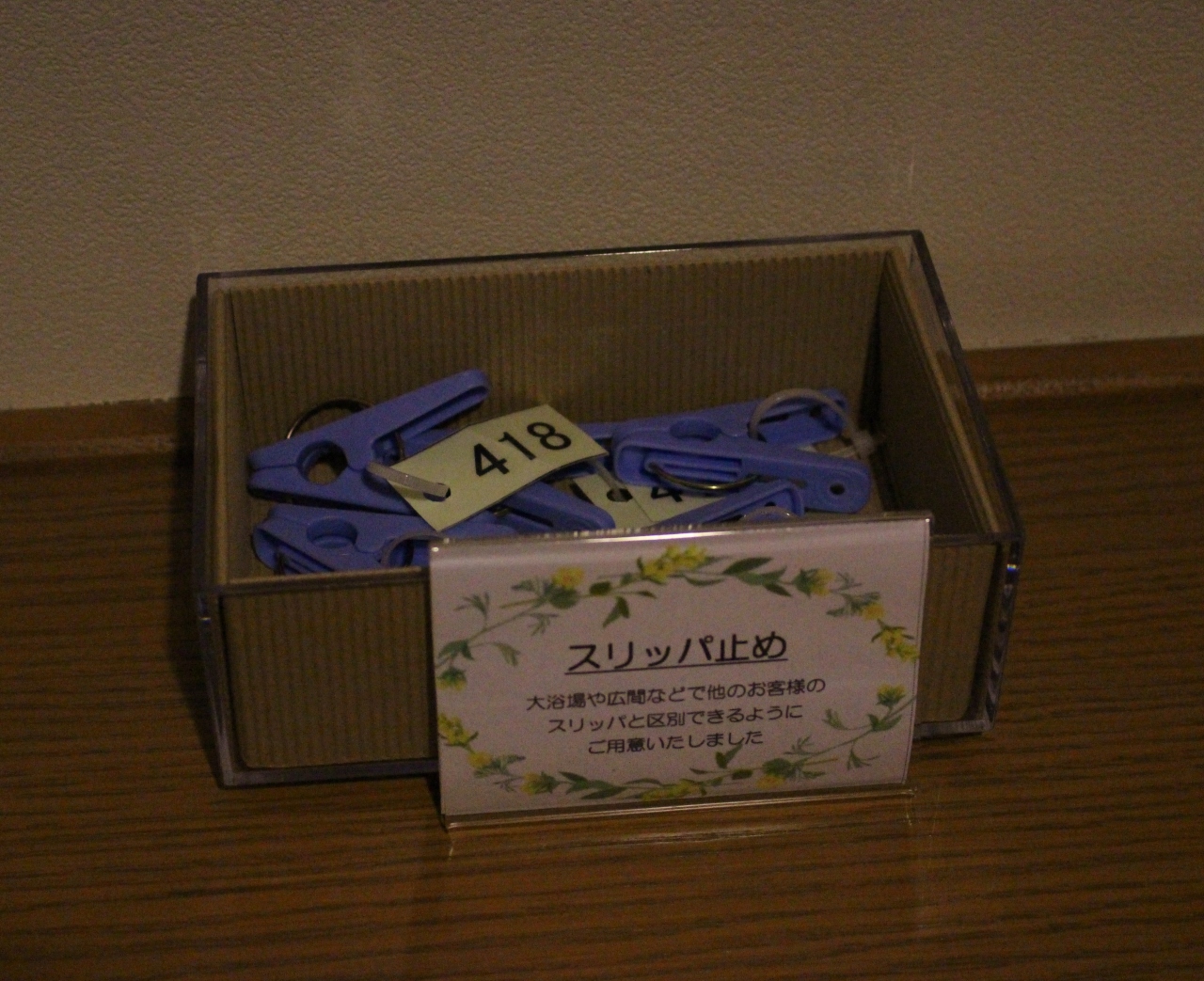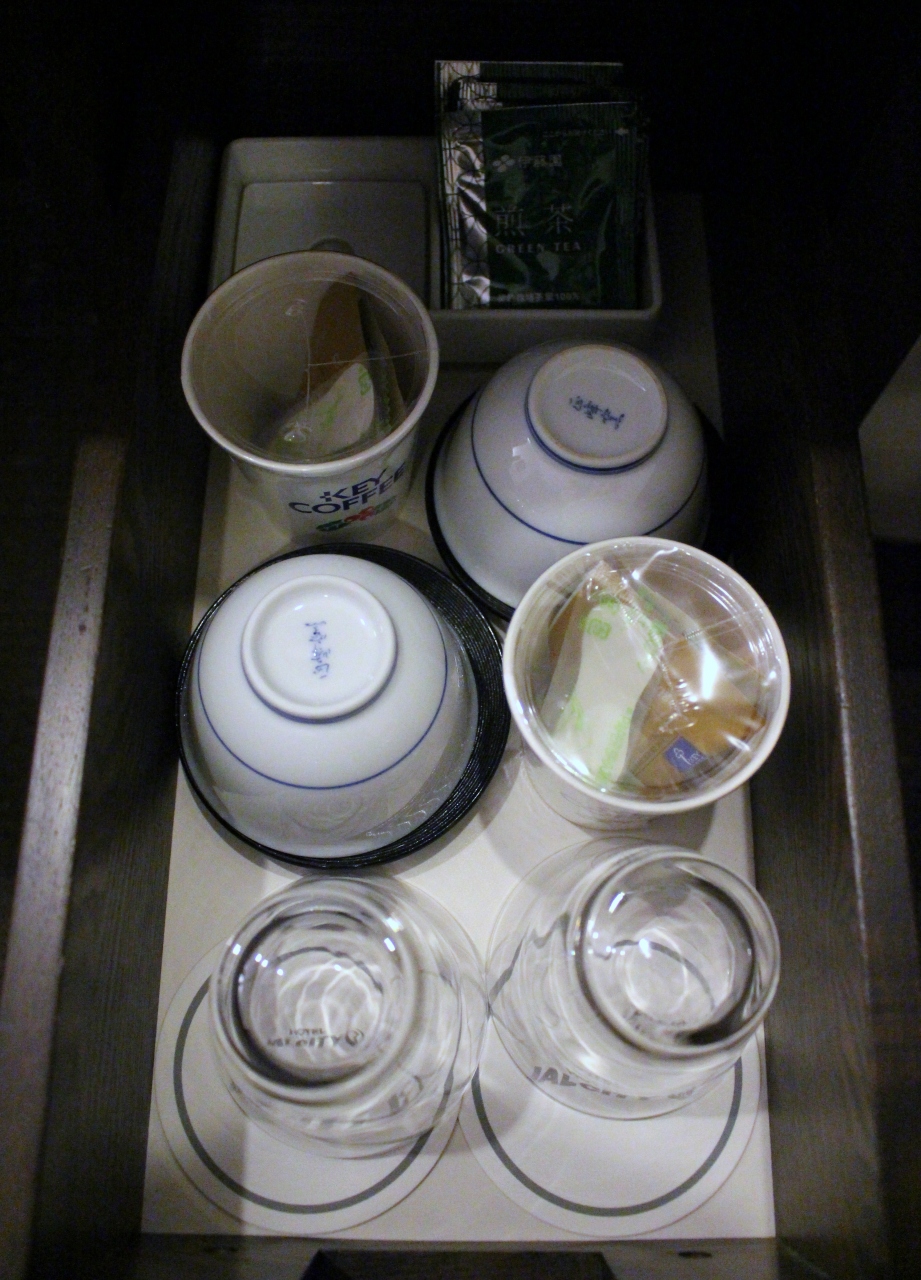 館内のいろんなところに小さな蓋付きの入れ物があってコンペイトウやハッカ糖が置いてありました。 普通、お部屋にお茶菓子の用意がありますが、お茶はほうじ茶と緑茶の2種類がありました。お布団を敷きに来たあとは冷水が置いてあるのは温泉宿なら当たり前でしょうが、急須と湯呑は違うものになっていて梅干しやつくだ煮などのお茶うけもおいてありました。