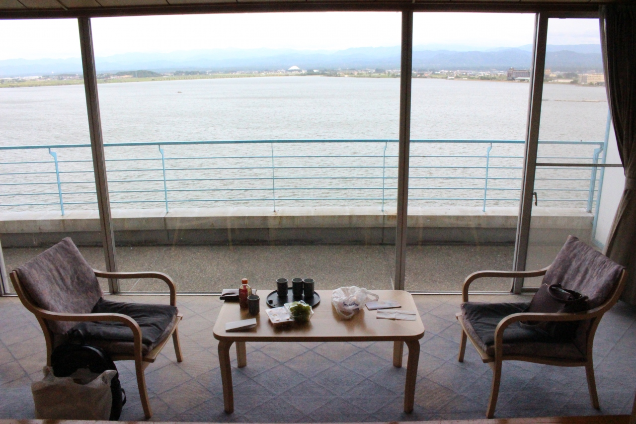 全館柴山潟に面していてどのお部屋からも、カフェラウンジ、大浴場からも柴山潟と白山が見渡せます。