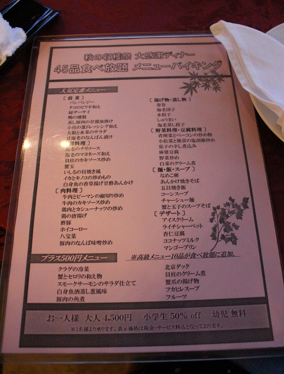 開業45周年で45品が食べ放題になるというので初めてのオーダーバイキングに挑戦しました。4500円のところ優待券を使うと3900円になります。その優待券はフロントに置いてあるというのだからなんとも太っ腹。