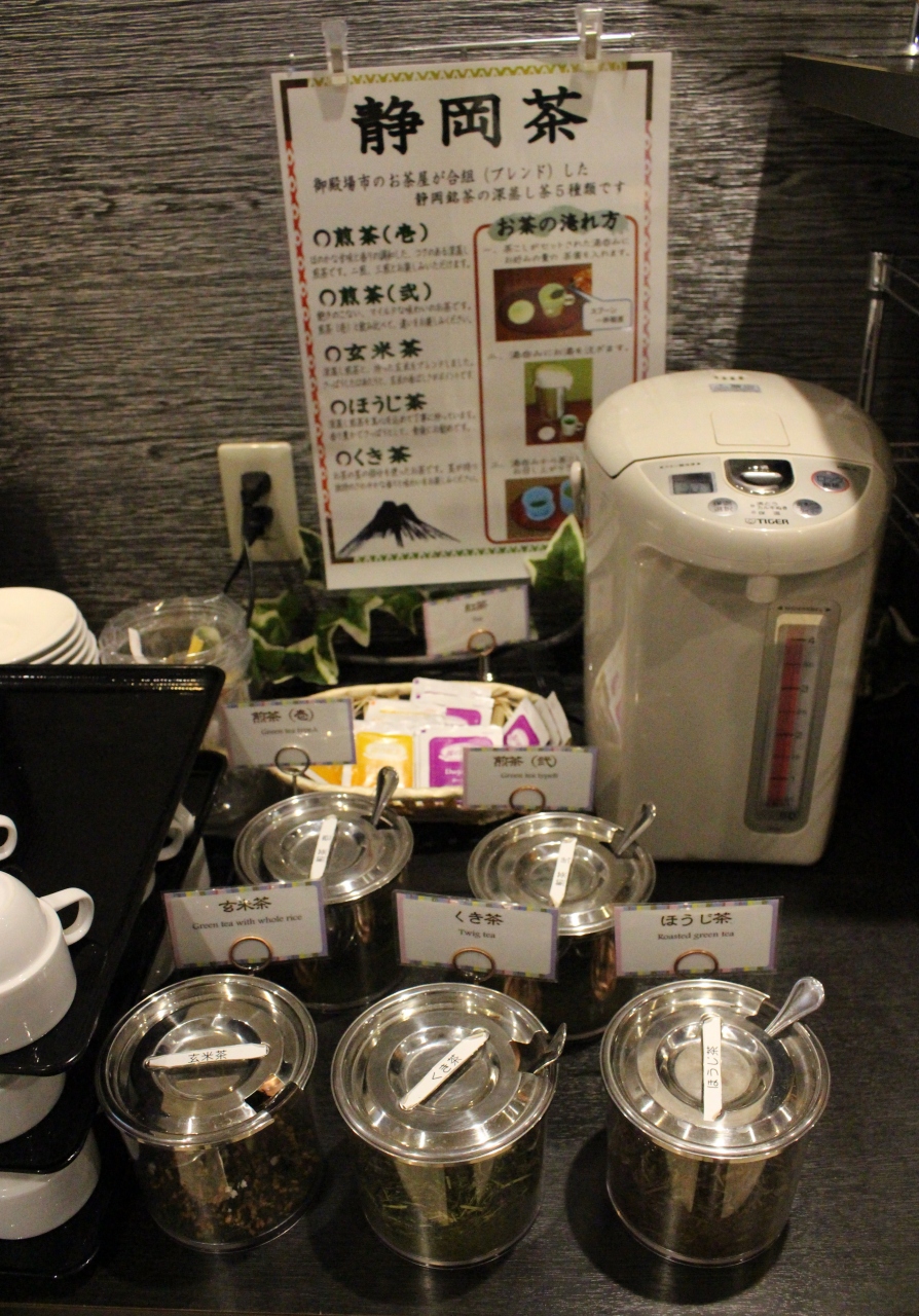 朝食はちょうどお正月ということもあって、おせちもあり、買うとお高いので今年はこれで十分! と思えました。何種類かお茶がありましたが、一番茶がおいしくてお代わりしました。ファミレスにあるような自分でお茶葉を入れて作るタイプです。このお茶の入れ方をホテルでしているところは珍しいと思います。さすが茶処静岡です。
