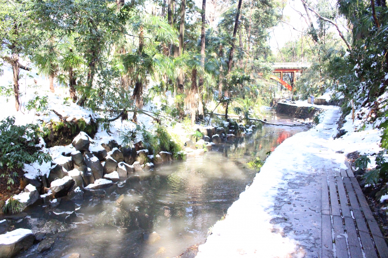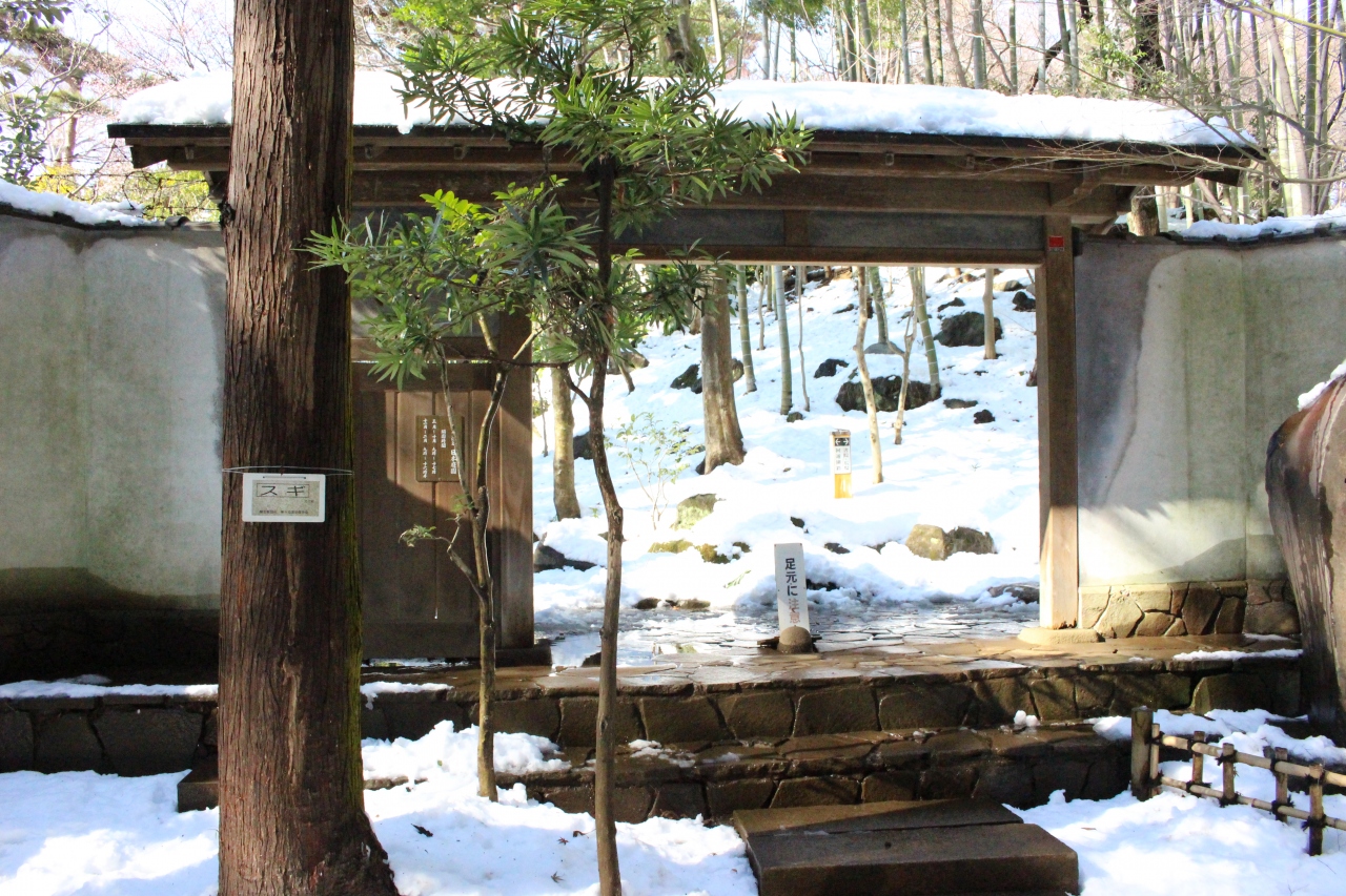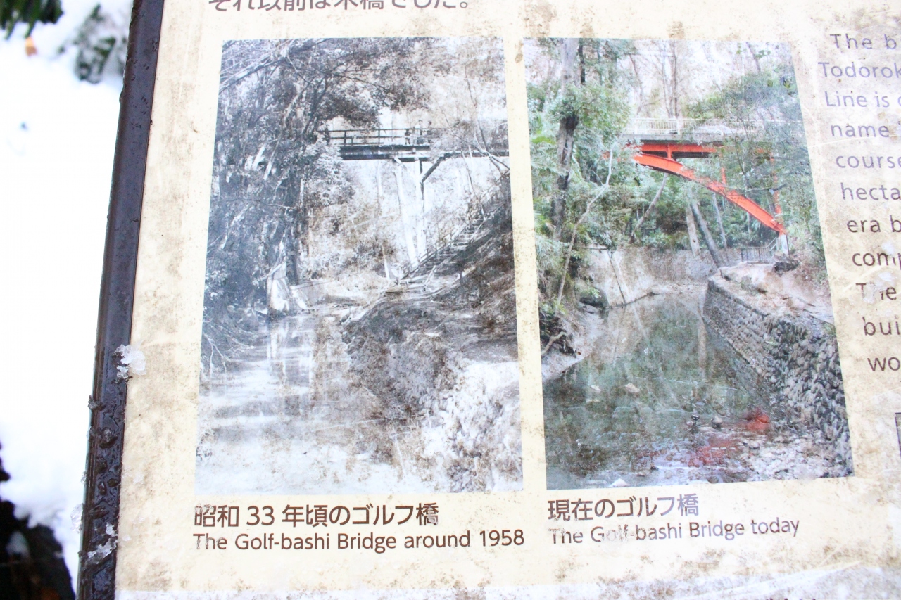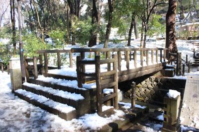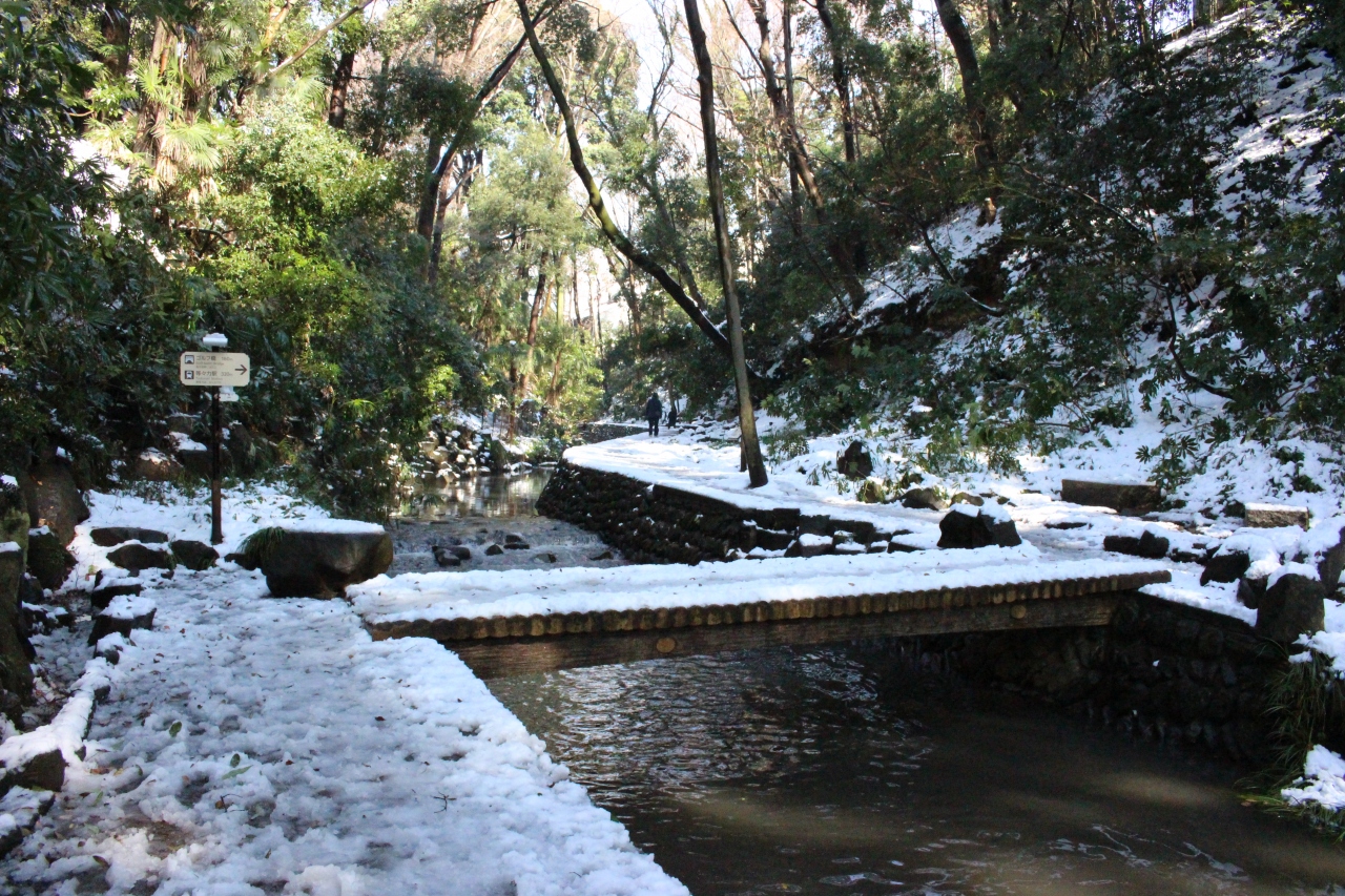東急大井町線の等々力駅より徒歩で2分ほど。『ゴルフ橋』という変わった名前の橋の袂から等々力渓谷公園の始まりです。現在玉川野毛町公園に残る緑地がゴルフ場の名残だそうです。約1キロの散歩道ですが雪道はなかなかお目にかかれないと思います。