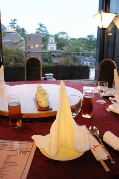 オーダーしてから調理してくれ一人分でも作ってくれますから全員同じものを食べなくてもいいんです。予約されたテーブルは尾山神社が目の前に見える場所でステンドグラスがどんどん夜の空に明るく光ります。
