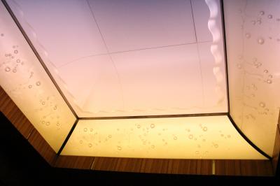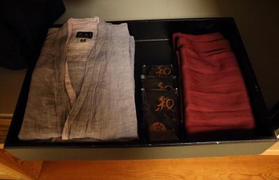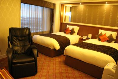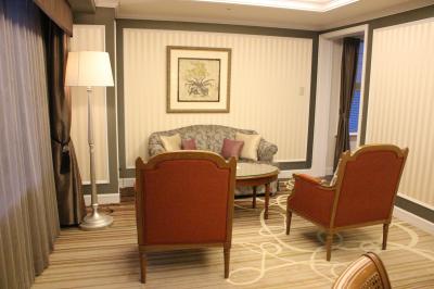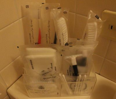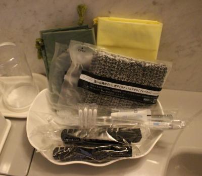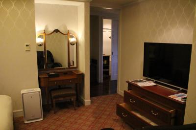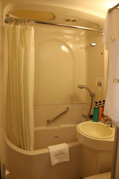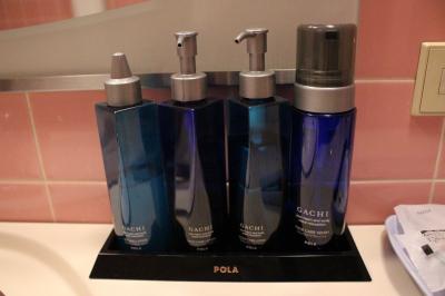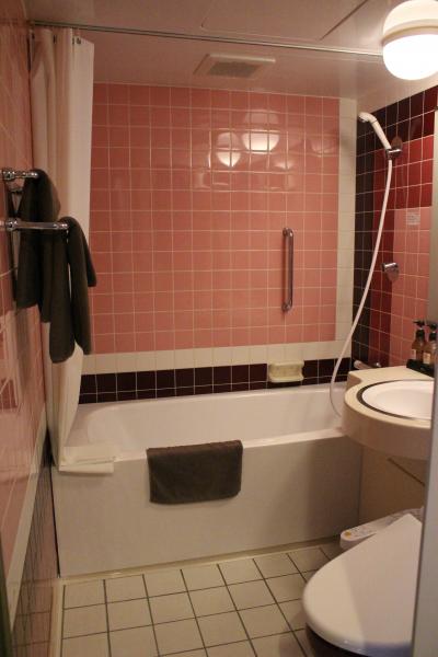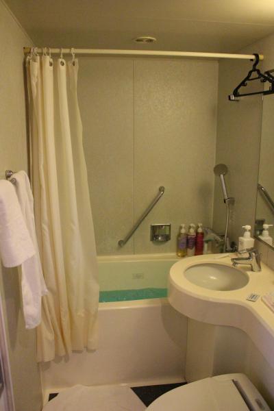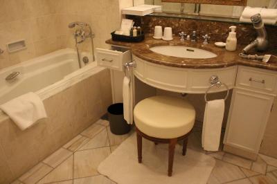 部屋もバスルームも広かったです。鏡周りには泡で出てくる洗顔フォーム、化粧水、スタイリング剤、整髪料が揃っていて珍しいな と思いました。テレビも大きく目覚まし時計は我が家のとよく似ていて、いわゆるホテルのアラーム時計ではなく普通の目覚ましでした。2種類の椅子があり、バスタブも広いのですが水はけの悪さが目立ちました。お風呂を使った後はバスマットはびちょびちょ、スリッパもビニール張りのもので何度も拭いたのですが縫い目から水分を吸収しているためか足裏がいつまでもぬれていました。1種類スリッパを置いてくれるならタオル(パイル地)のものがいいですね。