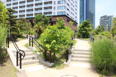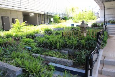 後から知ったのですが庭園の下を車が走っているんですね。全然音も振動もなかったのでわかりませんでした。 246号線を挟んだ向かい側の小さなエレベーターで上がり歩道橋を渡って入りました。管理事務所からずっと坂道を登って行くように庭園が続いています。プリズムタワーからも直結です。植物には皆名前が記されていて犬の散歩をさせている人、お昼ご飯を食べている学生さん、走る人、ウオーキングの人さまざまです。途中にエレベーターもあったので簡単に庭園中腹まで上がってこられそうです。一番上には見晴台のような小さなエリアがあり、目黒区の図書館などが入ったビルの9階にたどり着きます。このビルのトイレは自動ドアで授乳室が2部屋もありました。目黒区民はこんな税金の使い方をされて羨ましく思いました。