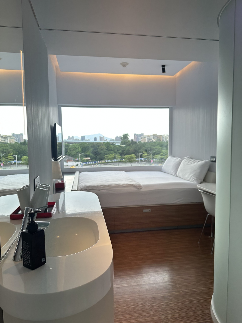 シティービューの部屋おすすめ!横幅ベッドサイズ、高さ天井ぐらいまであるおっきい窓がベッドのすぐ隣についてて、開放感が良い。後、エアコンは部屋にあるタッチパネルで操作できる!照明の色とか、なんか色々全部タッチパネルにあるから、泊まる人はタッチパネル絶対最初に一通りチェックした方がよいです。