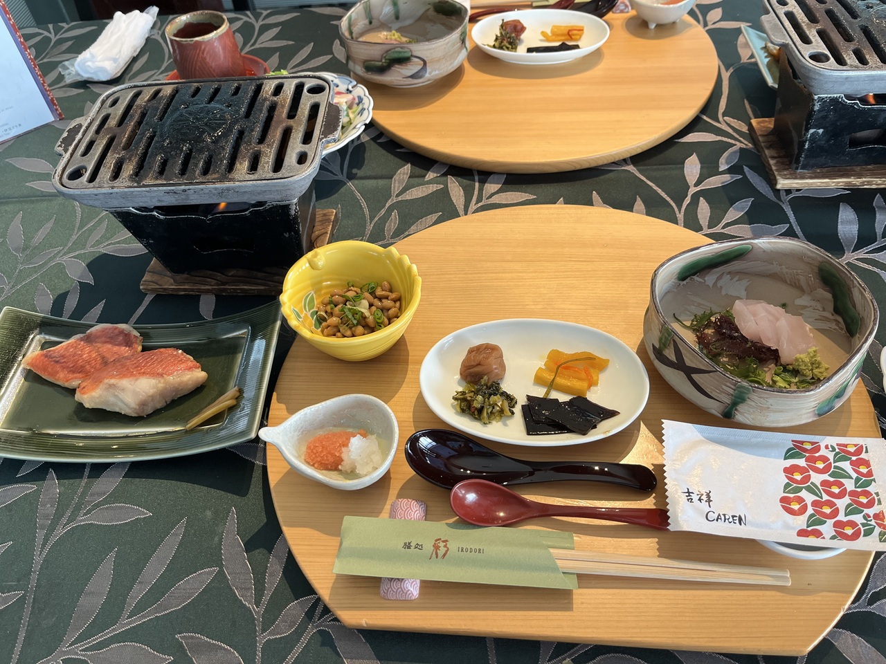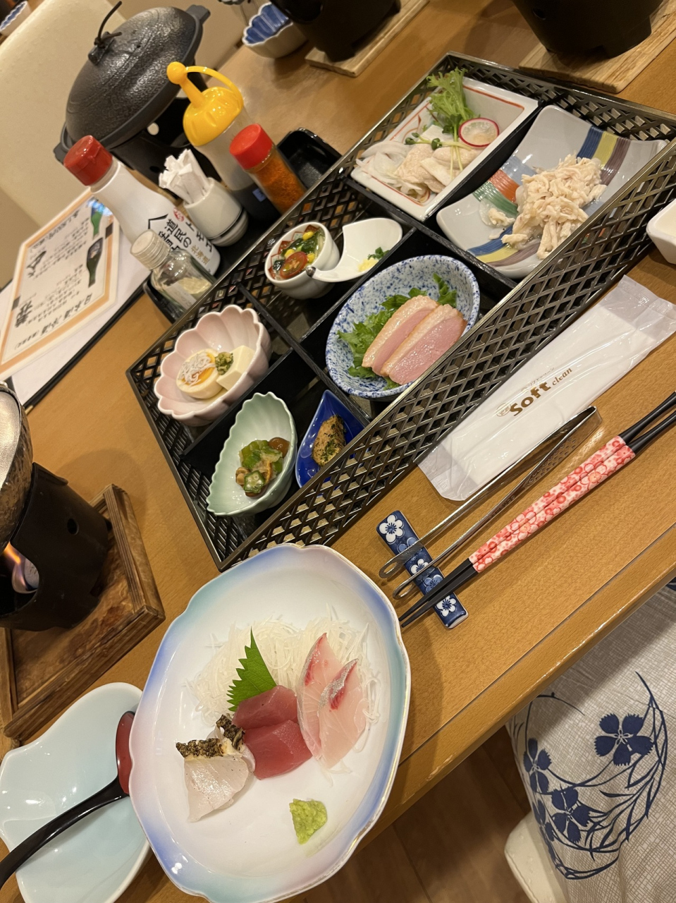 肉料理、魚料理ともにありました。デザートや、ソフトドリンク、サラダなどはセルフサービスでした。お風呂は、三箇所あり、男女入れ替え制でした。6階の露天風呂は、そこそこ広くて気持ち良かったです。- 旅行時期