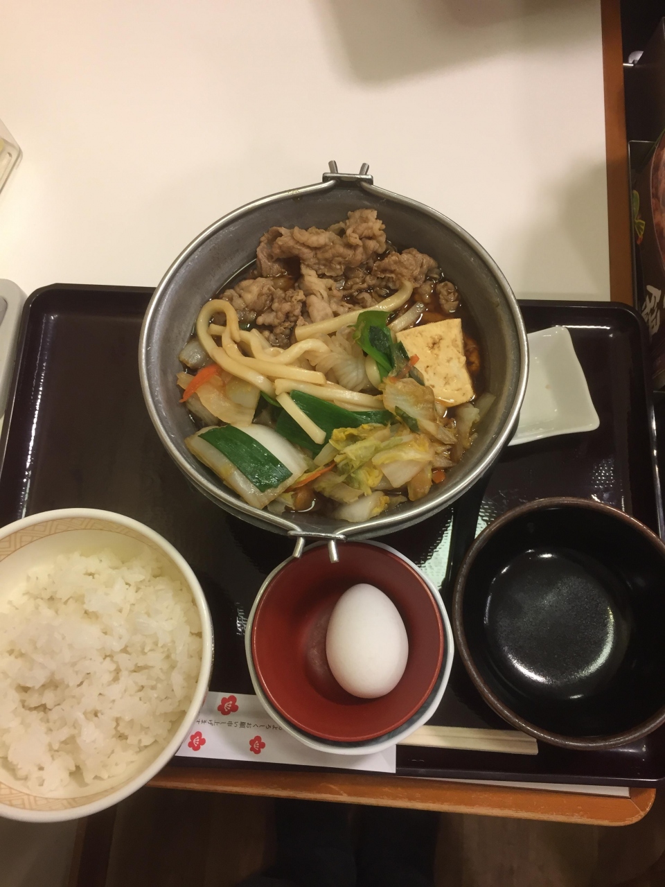 夫とふたりだけで自宅ですき焼き!なんてめんどうなので、すき焼きっぽいのを食べに来てみました。吉○家さんにも、同じようなメニューがあるようですが、こちらのお店の方が少しだけ高いようです。牛肉の他、野菜や豆腐も入っていて、卵もついていました。普通に美味しくすき焼きを頂きました。我が家は、駅ではなく路面店に行ったので、駐車場もあって便利でした。