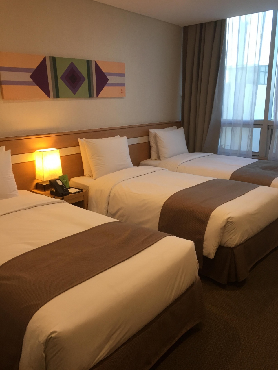 忠武路駅から歩いて3分くらいで、明洞までも徒歩圏内というとても便利な立地でした。友人3人で、シングルベッド三台のトリプルルームだったので、若干狭さを感じました。が、清潔感のある部屋、洗浄付き便座、日本語のできるフロントなどの点からリピート間違いなし!のホテルになりました。