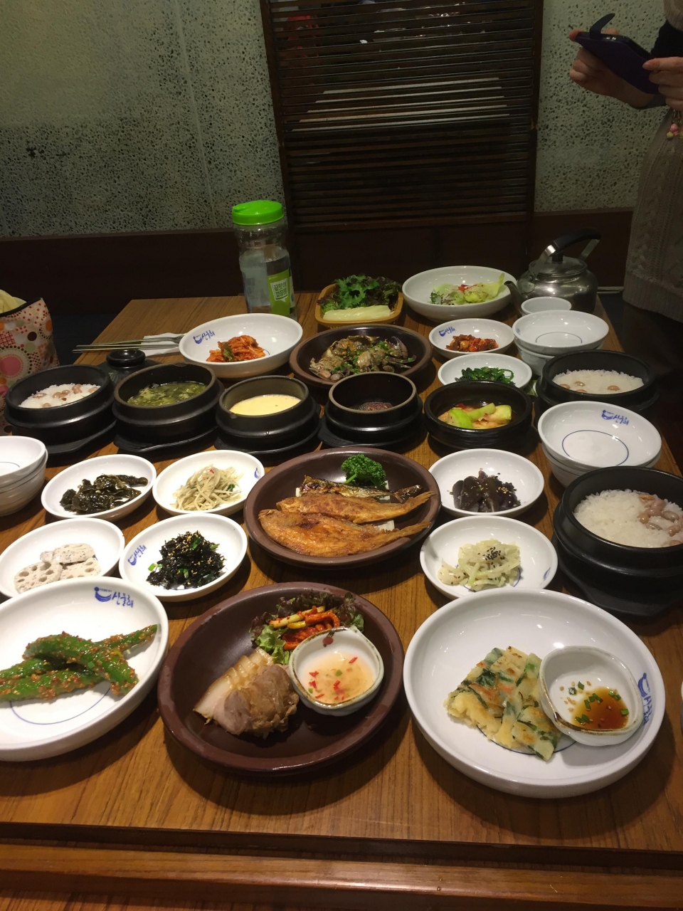 go to mall で買い物をして、その後にディナーとして行きました。屋外に出ることなくたどり着けますが、地下街の奥まった場所にあり、分かりづらかったです。待たずに入店できましたが、家族連れで大にぎわいでした。韓定食を3人前オーダーしました。大きなワゴンでたくさんのおかずが運ばれてきます。おかずの乗っている板?ごとテーブルに置かれます。驚きました!ご飯も美味しくて、おこげもいただきました。