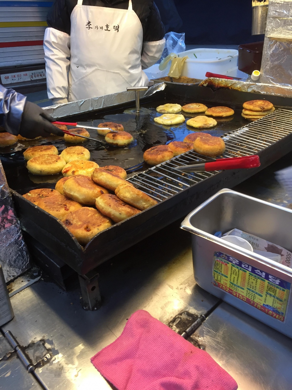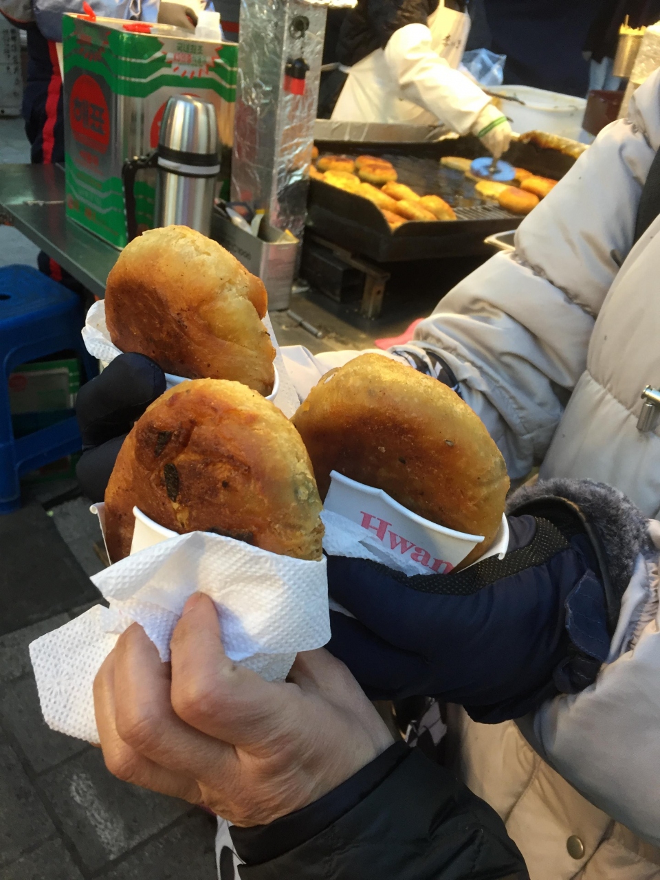会賢駅5番出口を出てすぐのところにあるお店に行きました。今回は、並んでいる人がいなくて、すぐに買うことができました。一つ食べると、かなりボリュームあるのでお腹がふくれました。野菜ホットクと言う名前ですが、チャプチェがたっぷり入っていて美味しいと思います!
