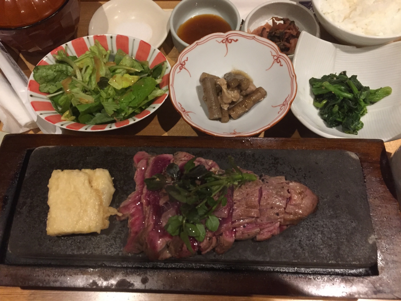井の頭線渋谷駅から近くて便利な場所です。ちょっとお高めの和食屋さんです。カウンター席やテーブル席がありました。ステーキと丼の定食を頂きました。どちらも美味しかったです。ゆっくりするという雰囲気はない感じでした。