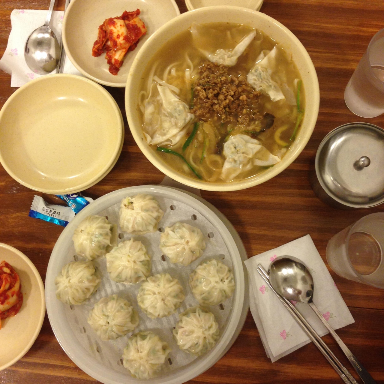 南大門市場でホットクを食べた後に、小腹が空いたねってことでここに来ました!24時間営業なので夜遅くても大丈夫です。店内満席で、少し外で待ちました。席があくと、お店の方が呼びに来てくれました。キムチが美味しくて、友人はお土産に持ち帰りました。