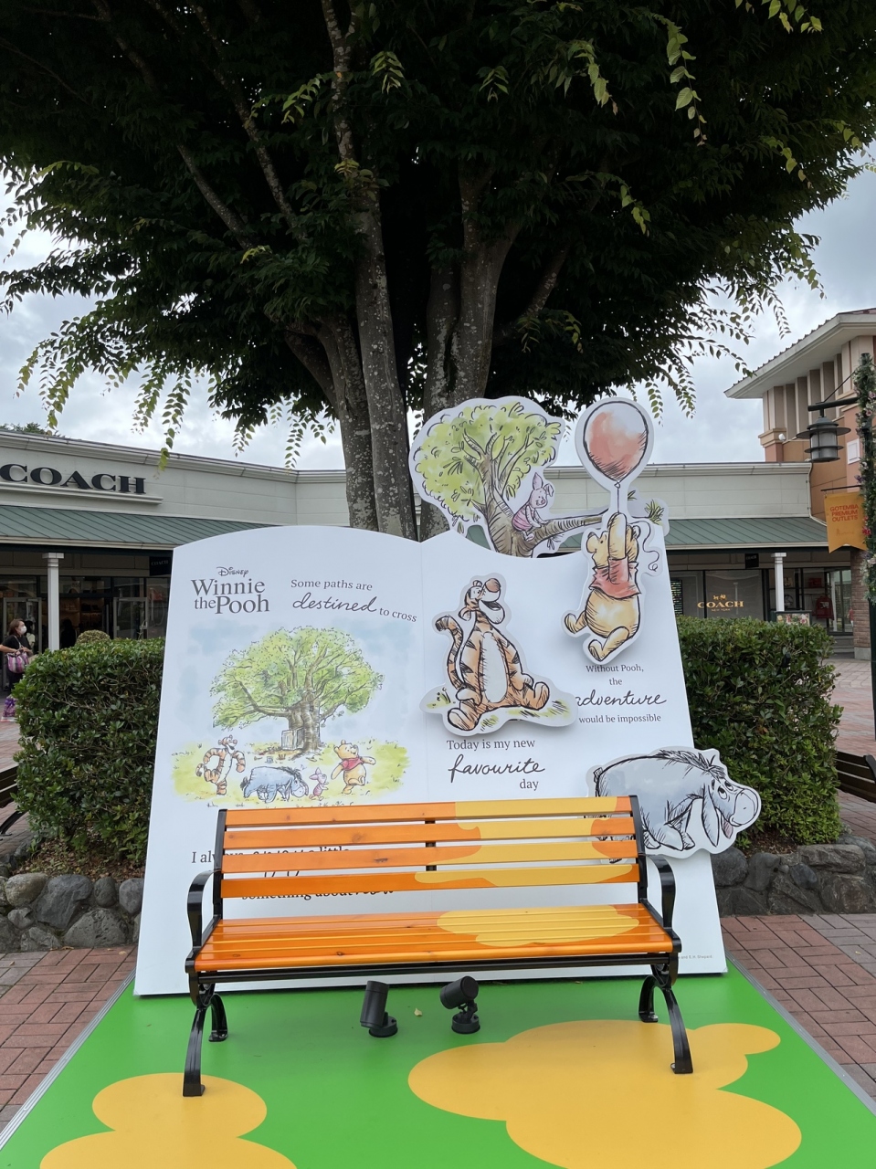 何とか雨にならず、曇り空のもと、ゆっくり買い物をすることができました。平日でしたが、それなりのお客さんがいました。GAPやフォションのある側まで行くと、フォトスポットがありました。くまのプーさんのイラストが描かれたかわいいエリアでした。イベントごとに変わるステキなフォトスポットです。