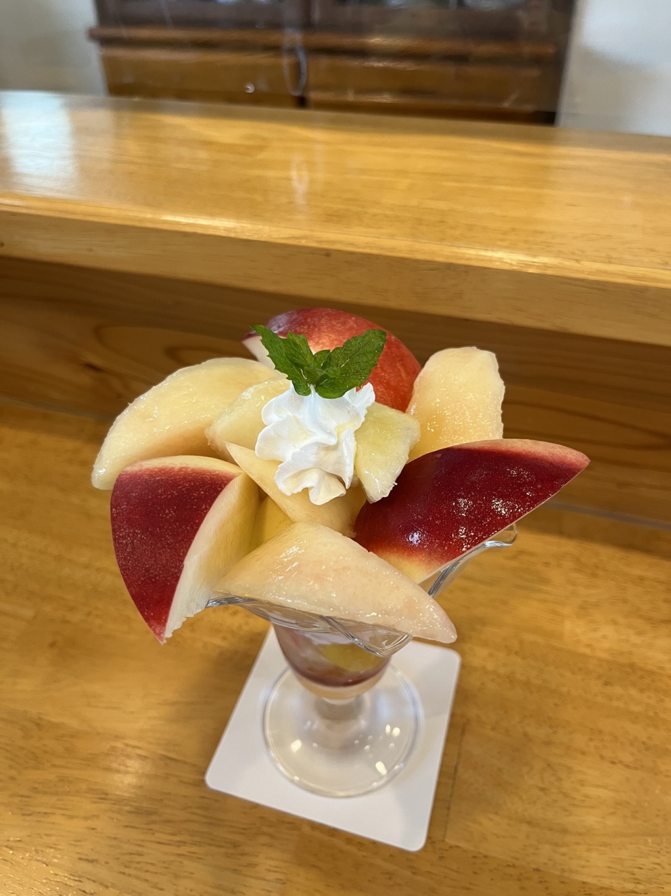 昨年に続いて、年に一度の桃パフェを食べるために、予約して伺いました。平日に予約を入れたのですが、なかなかの混みようでした。