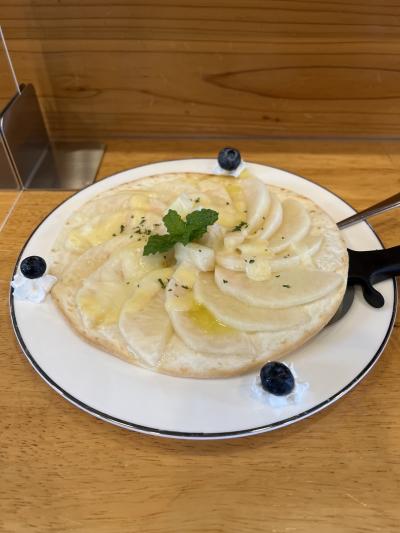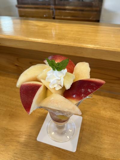 念願の桃パフェと、桃ピザをいただきました。桃は、ジューシーで甘くてホントに美味しかったです!