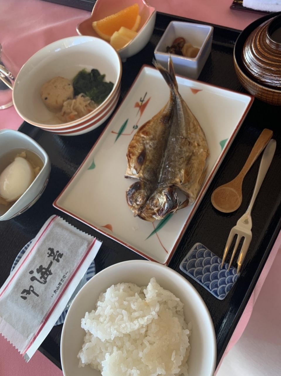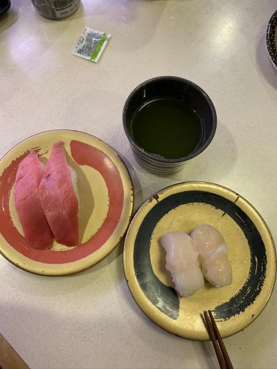 いつも頂くお気に入りのお寿司を数皿と、あおさの味噌汁を頂きました。醤油の種類がいくつかあります。- 旅行時期