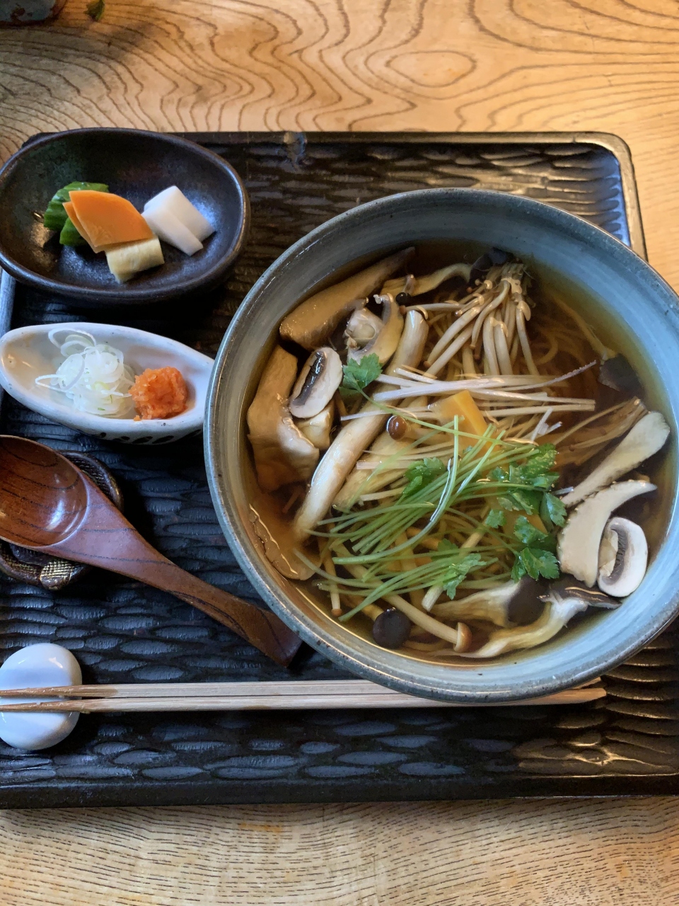 季節のきのこそば1800円をいただきました。数種類のきのこが入っていて、細めのお蕎麦もツルツルッとして美味しかったです。雰囲気込みのお値段という感じです。クレジットカードで支払えました。- 旅行時期