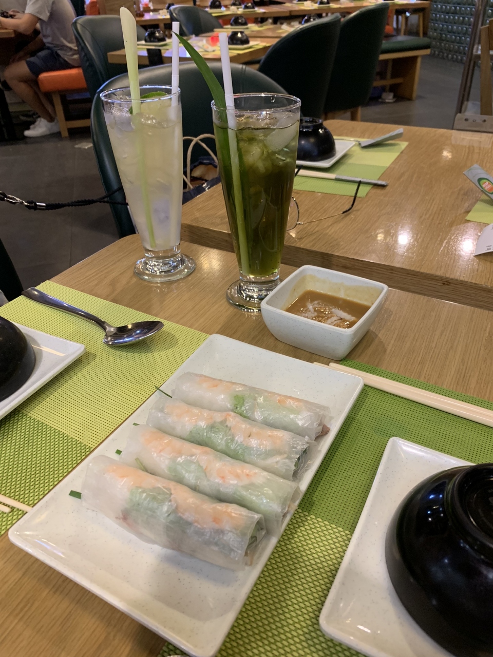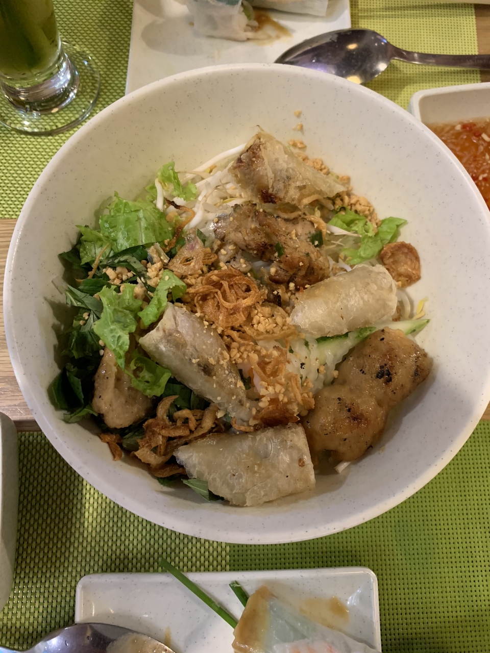 ビンコムセンターであちこち散策した後で、フードコートにあるこちらのお店でランチを摂りました。ノボリを立てて宣伝していたフォー丼みたいな物と揚げ春巻きとドリンクを頂きました。店のスタッフさんは、とても親切でいろいろ教えてくれました!
