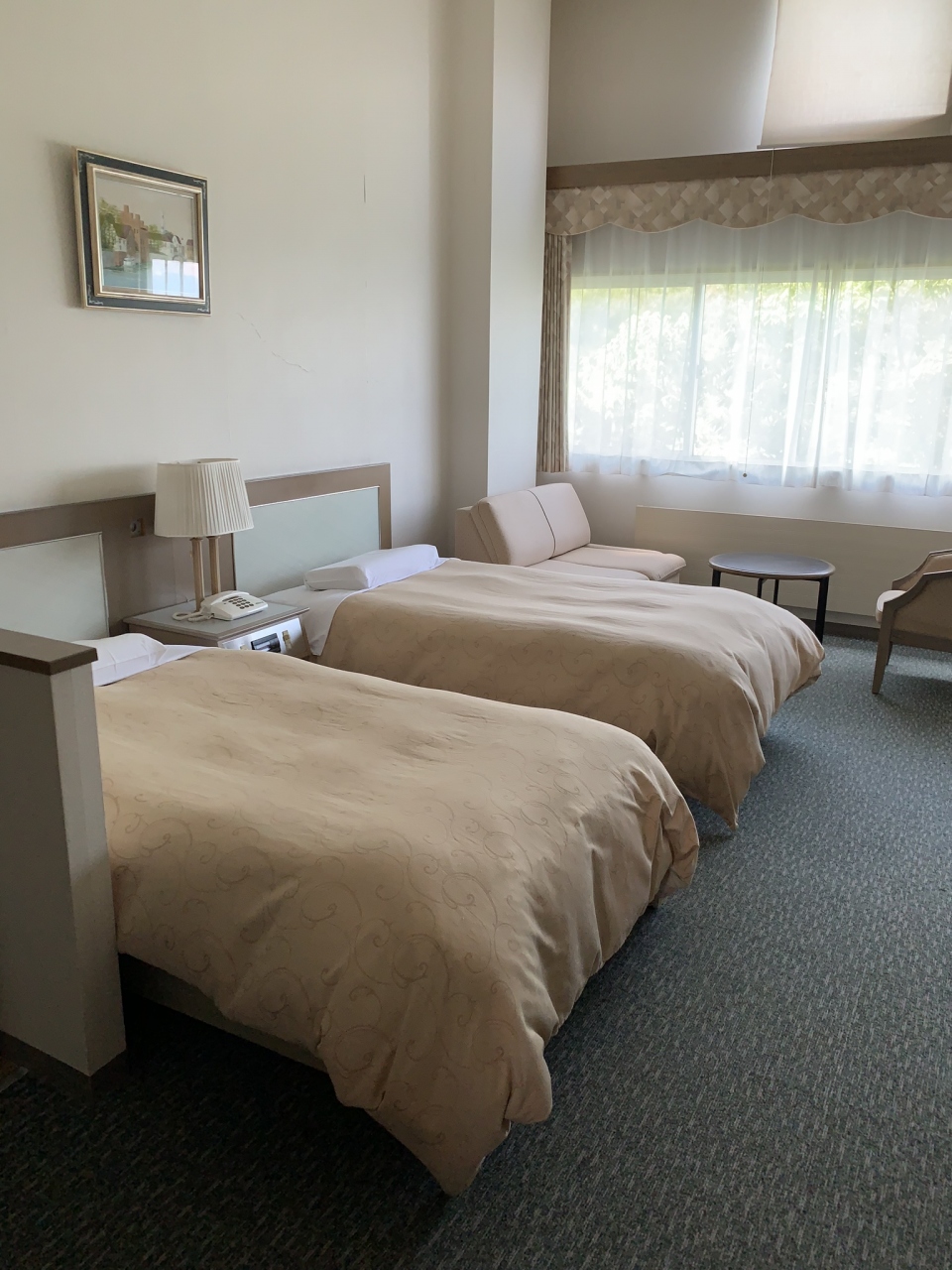 ビーナスラインを登ってリフト乗り場を過ぎた先にあります。ツインベッドとテーブルと椅子というシンプルなお部屋でした。窓からの眺めは、遠くに湖が見え、高原リゾートにいることを感じさせてくれました。夏休み中なので、家族連れが多くとても賑やかでした。別の季節に滞在してみたいと思います。