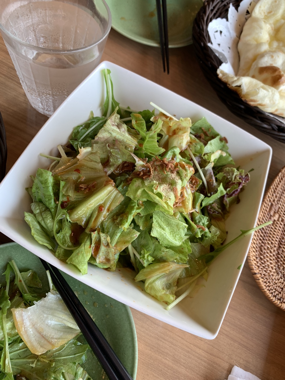 野菜のカレーとナンとサラダを頂きました。サラダは、二人でシェアするのに十分でした。お子様並みの辛さを選択。ナンは、焼きたてでほのかに甘さがありました。おかわりできました。- 旅行時期