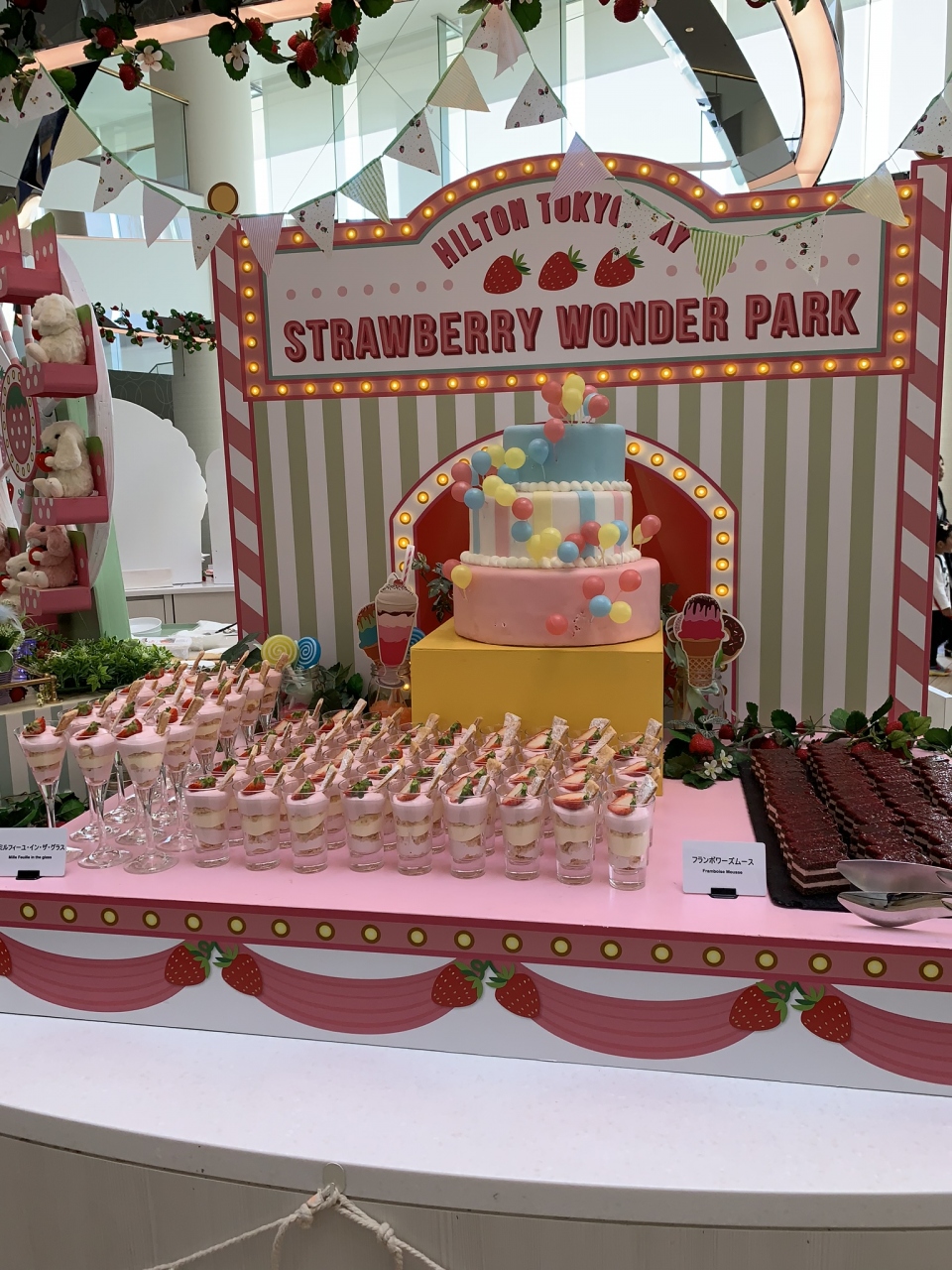いちごの季節でしたので、ストロベリー ワンダーパークと言うブッフェでした。予め予約をして行きました。スタート直後は、混み合っていましが、食事が始まると空いてきます。甘いものばかりでなく、サンドウィッチやサラダ、ピザ、フライドポテトなどもありました。みんな美味しかったです。以前は、コーヒーや紅茶は、スタッフの方がサービスしてくださっていましたが、今では、ドリンクバーになっていました。ピアノの生演奏もなくなり、ちょっと残念に感じました。