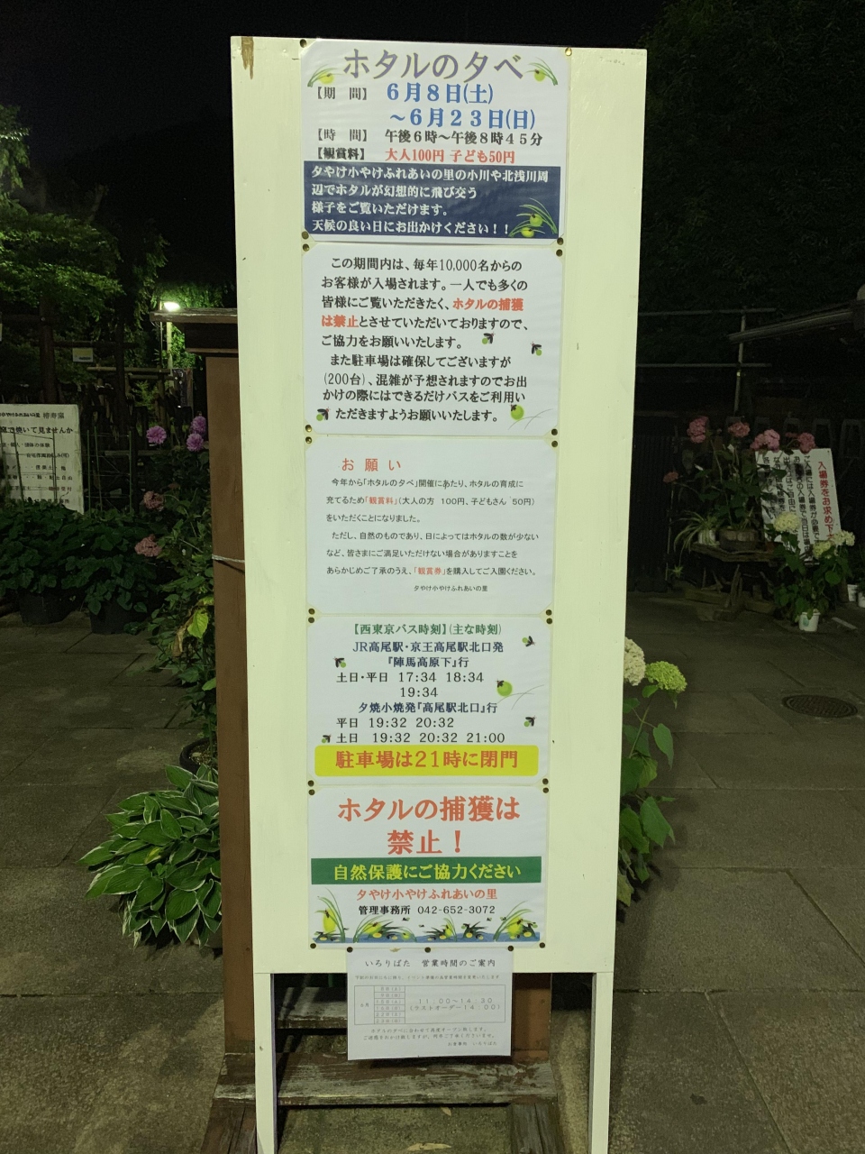 八王子市内ですが、かなり山の中に入った場所にあります。今の時期は、ほたるが見頃ということででかけました。無料の駐車場があります。ほたる鑑賞には、大人一人につき100円の入場料がかかりました。乱舞しているほたるではないですが、あちこちでポカポカッと光りを放ちながら飛んでいるほたるを見られました。