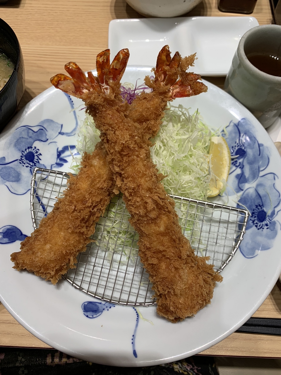 日曜日の晩御飯に伺いました。デパートのレストラン街にあります。混み合うかも?と思ったので、少し早めの時間にしました。とんかつ屋さんですが、私は海老フライ定食を頂きました。ぷりぷり感のある身で、とても美味しかったです!大きな海老が二本でした。ただ、あまり広々した店内ではなく、テーブルも小さめに感じました。