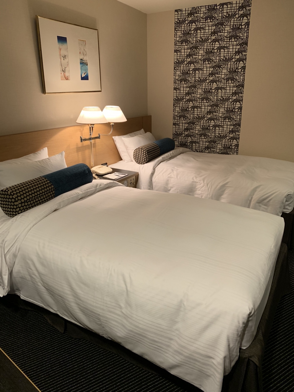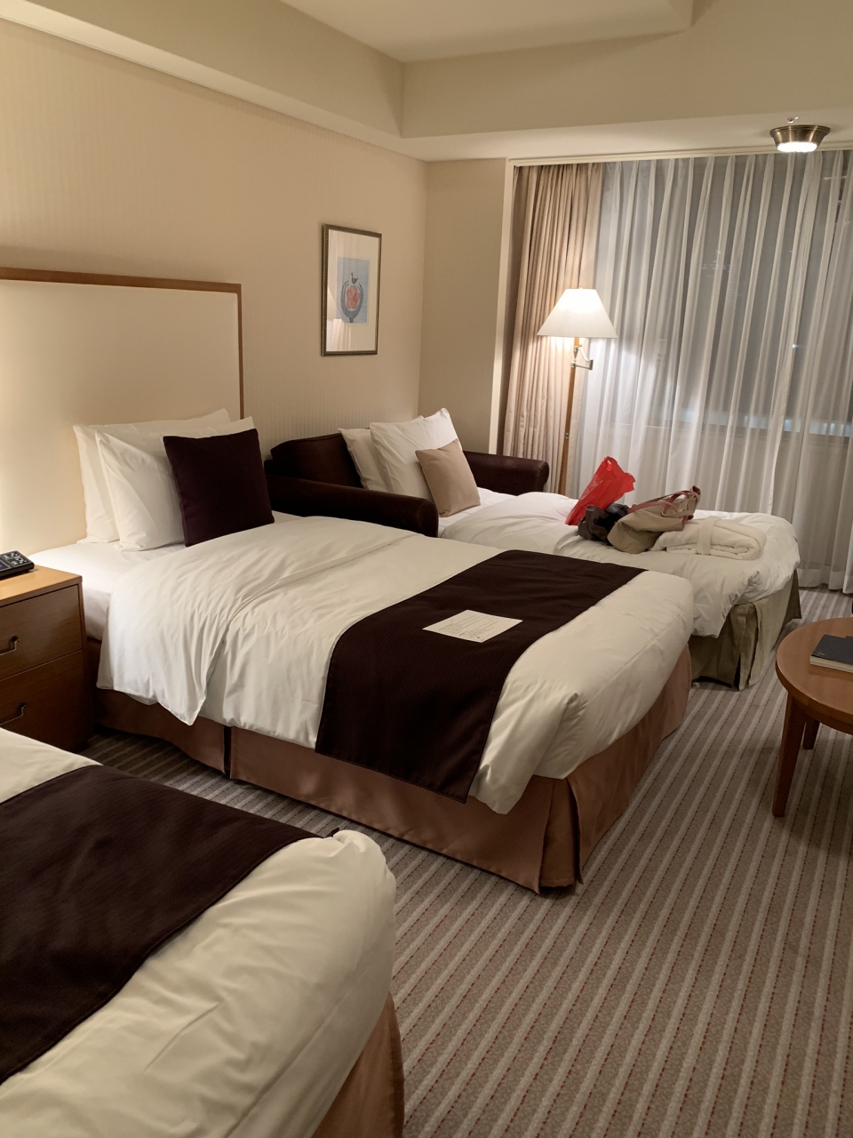 二泊三日の東京旅行、あるツアーに参加しました。その一泊目がホテルニューオータニでした。バスを降りてから、歩いてガーデンタワーに移動しました。アサインされた18階のお部屋からは、夜景が綺麗にみえました。三人だったのですが、広く感じるお部屋でした。エキストラベッドではなく、ちゃんとしたベッドが3台ありました。寝巻きやバスローブもありました。朝ごはんは、40階のレストランで頂きました!