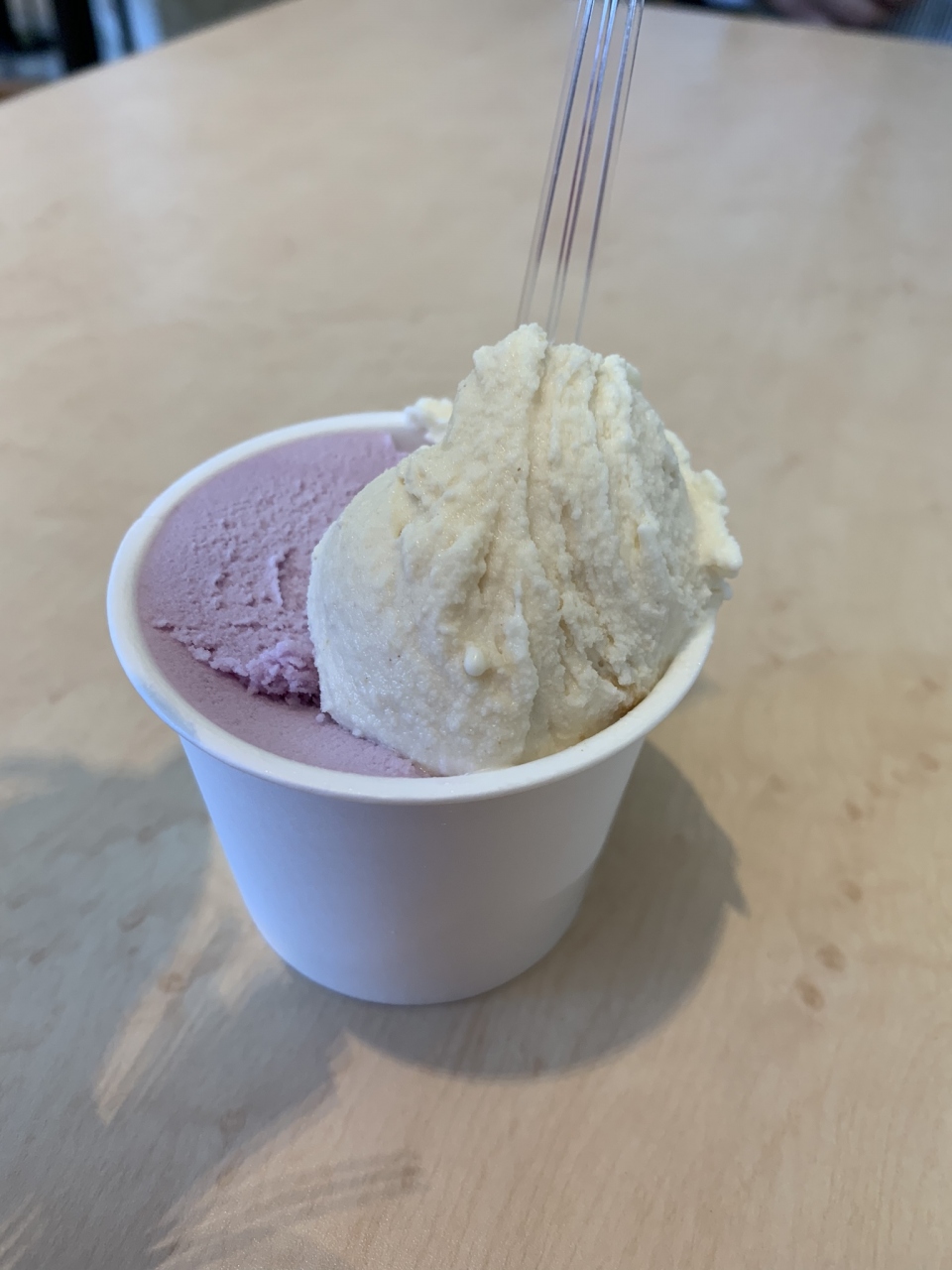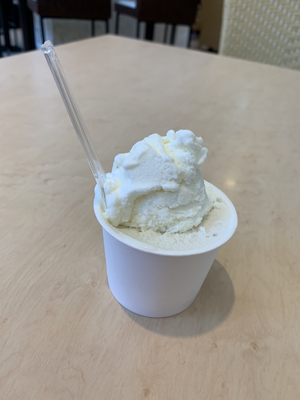 東京に帰る飛行機に乗る前に、お店に行きました。フードコートっぽくなっています。座席もわりとたくさんありました。カップに二種類のフレーバーを盛るダブルにしました。南国らしいフレーバーがあります。ハンバーガーもありました。甘すぎる味ではなく、さっぱりしたジェラートでした!