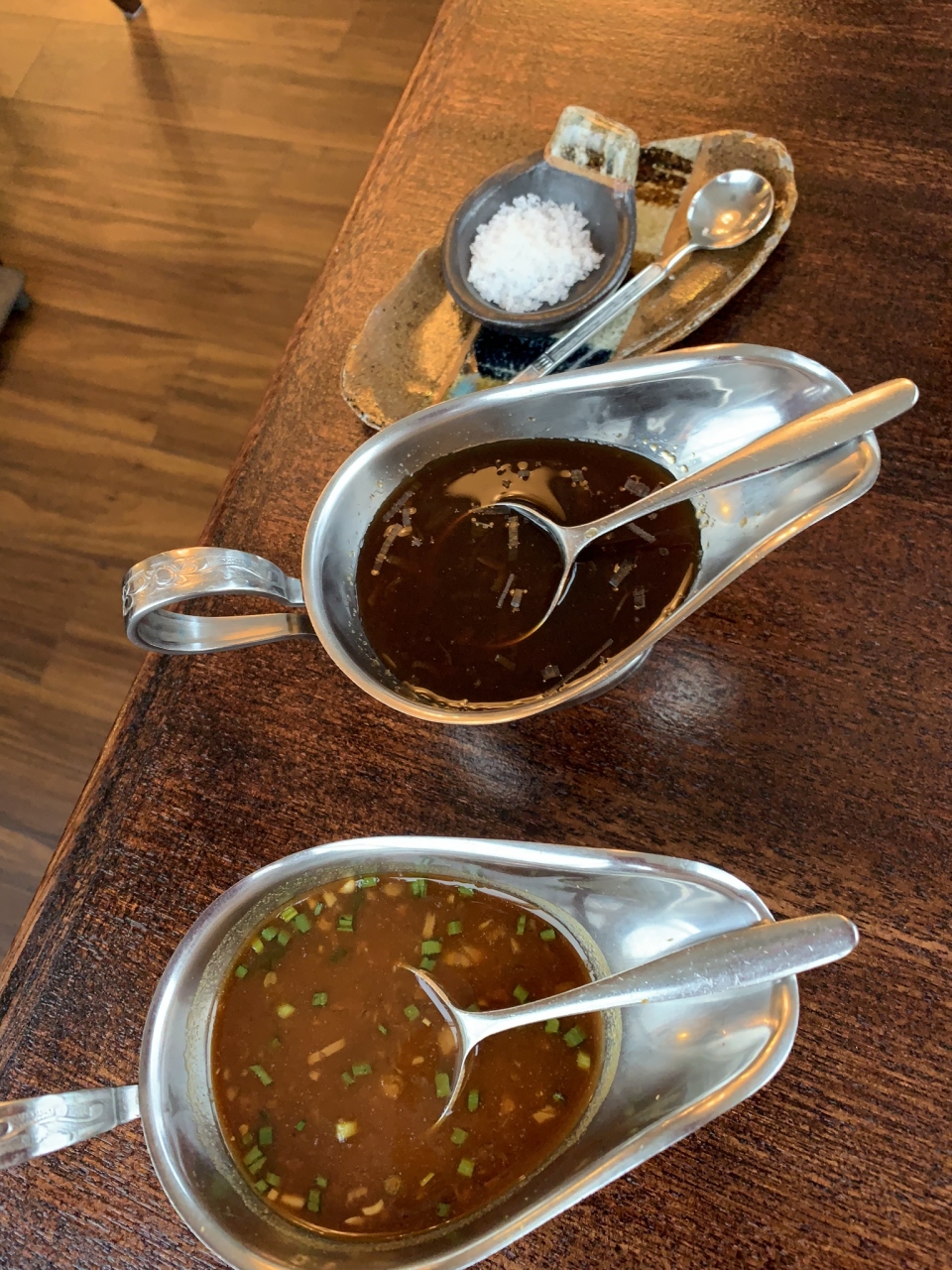 ソースやお塩もサーブされました。最初の一切れはそのままで、、と、教えて頂きました。美味しいステーキでした!一人前が8000円ほどのコースにしましたが、思い出のステーキになりました!