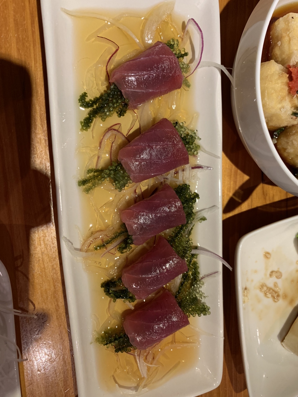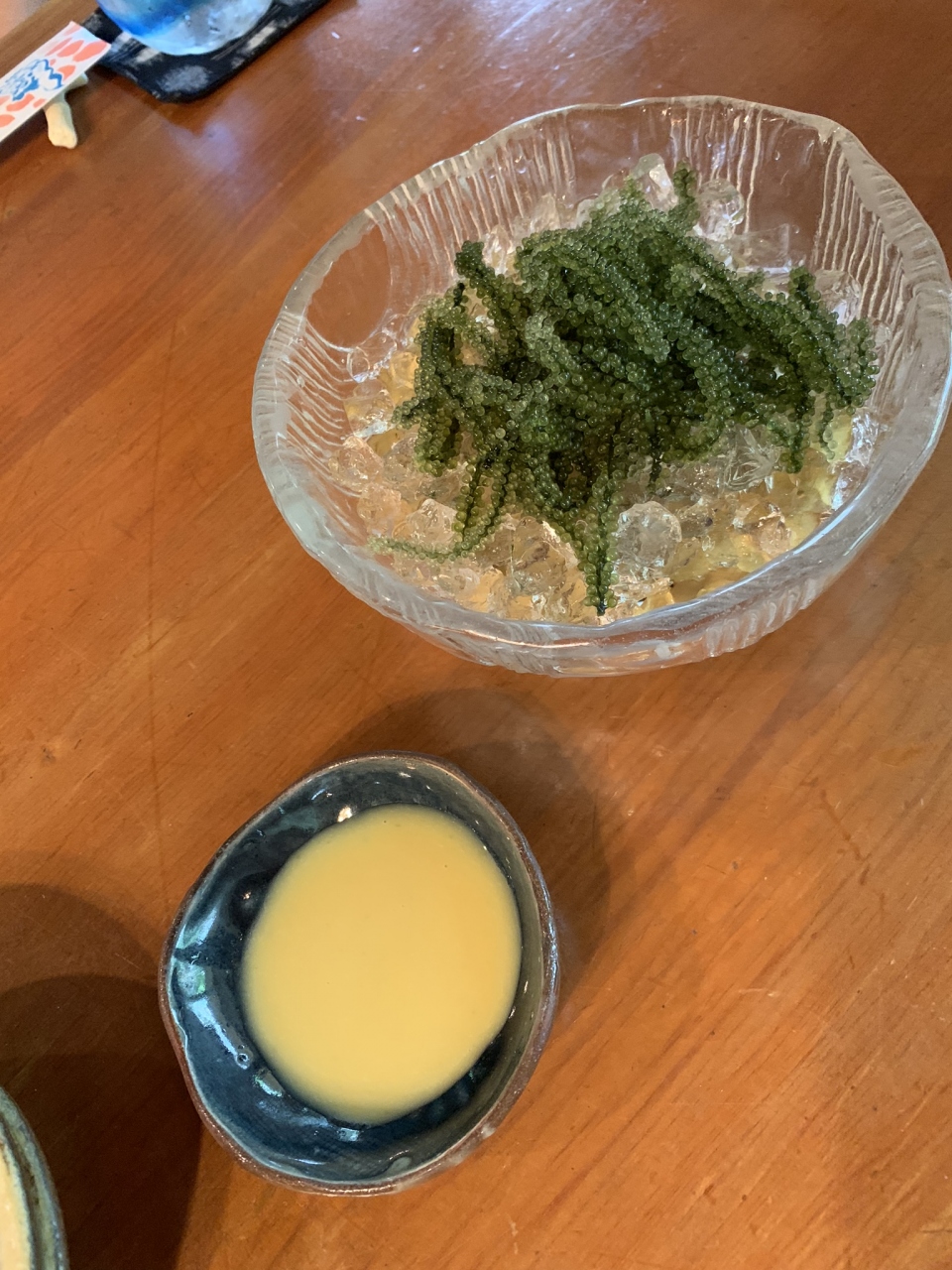 人気店なので、予め予約して行きました。お客さんが次々に入って来ていましたが、予約がないと難しそうでした。沖縄らしい料理をオーダーしました。海ぶどうは、弾力のあるプチプチ感で、味噌味のタレとよく合います。まぐろのカルパッチョも美味しかったです!