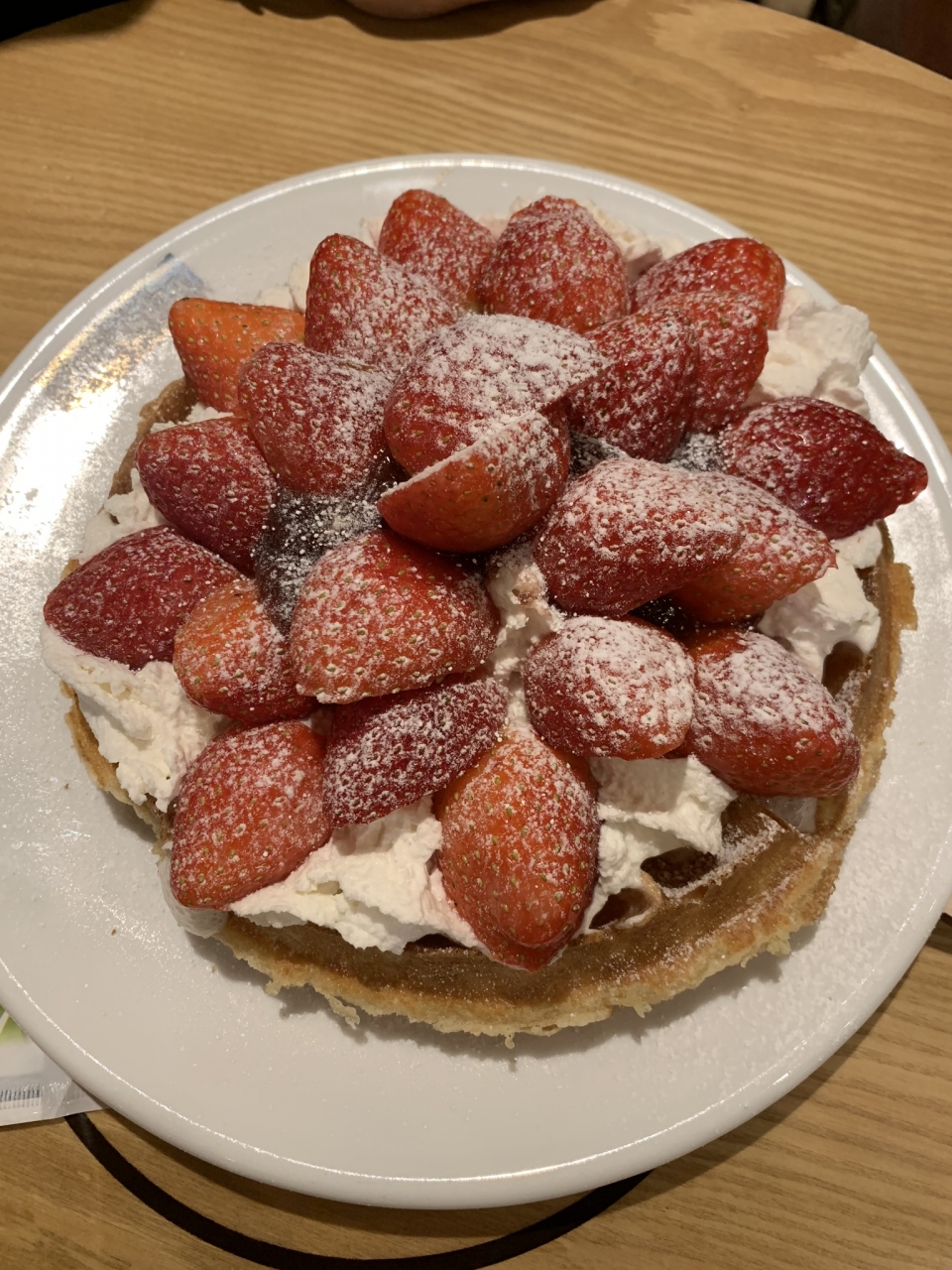 いちごのたっぷり乗っかったワッフルを頂きました!食後のデザートだったので、4人でひとつをシェアしました。甘すぎず、サクサクのワッフルは、美味しいと思います。こちらのお店は、フリーWiFiもあります。- 旅行時期