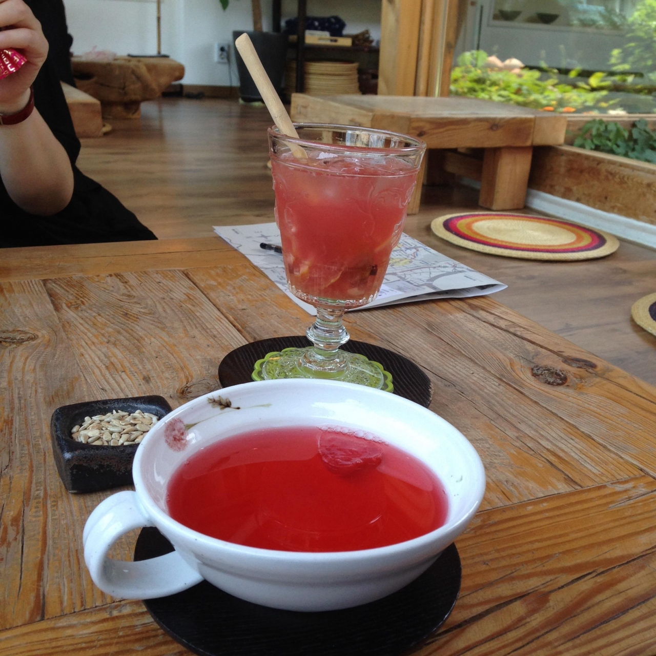 クロスガーデンと言うショッピングモールの中にあります。喫煙室も完備したコーヒーショップですが、紅茶やジュース、ケーキやサンドウィッチなどの軽食もあります。コーヒーは、かなり本格的なコーヒーで美味しいです!荷物入れの折りたたみ式のカゴや、寒い人用の毛布もあります。ショッピングモールには、いろいろなお店があるので、自由行動した時に待ち合わせに便利です。