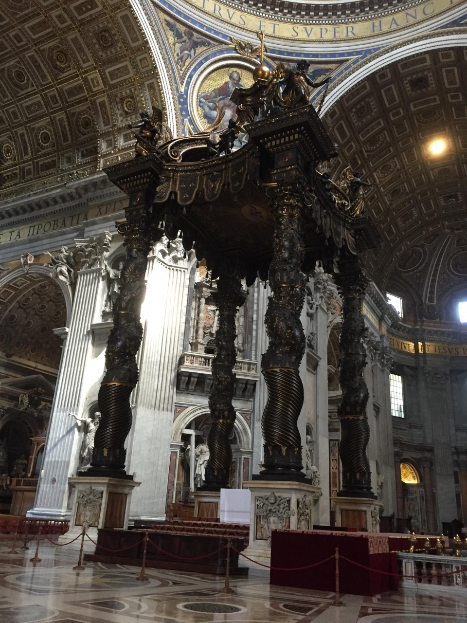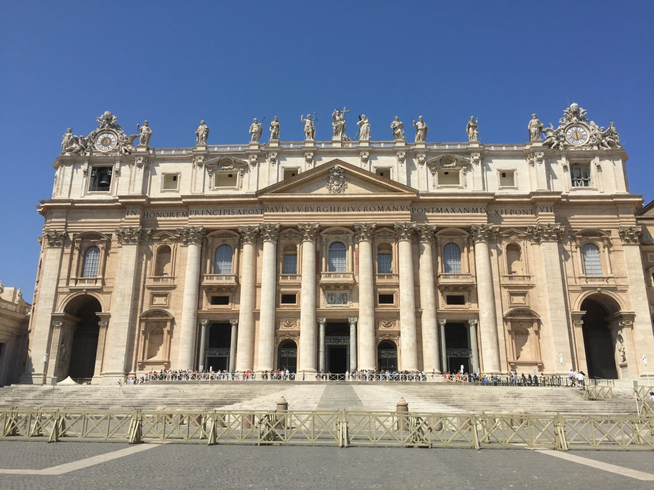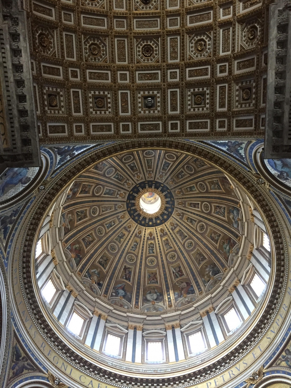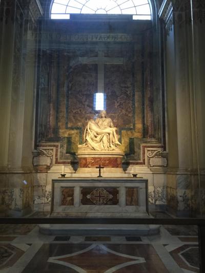 朝の9時40分くらいに着きましたが、10分くらいセキュリティーチェックに並んだだけで入ることができました。中は、多くの観光客がいましたが、ごった返していると言うほどではなく、そこそこゆっくり見ることができました。世界最大のカトリック聖堂と言われていすまが、どこを見ても豪華絢爛。バルダッキーノ、ピエタなど素晴らしい彫刻でした。